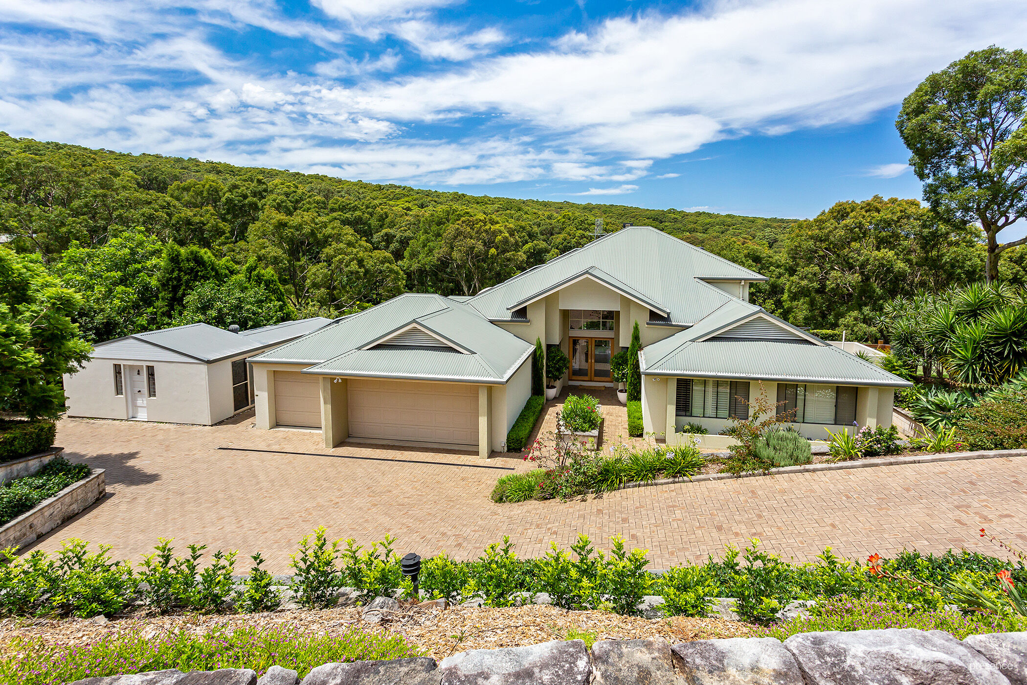 • 3 car garage with extra storage room and circular driveway set amongst limestone and sandstone terraced gardens