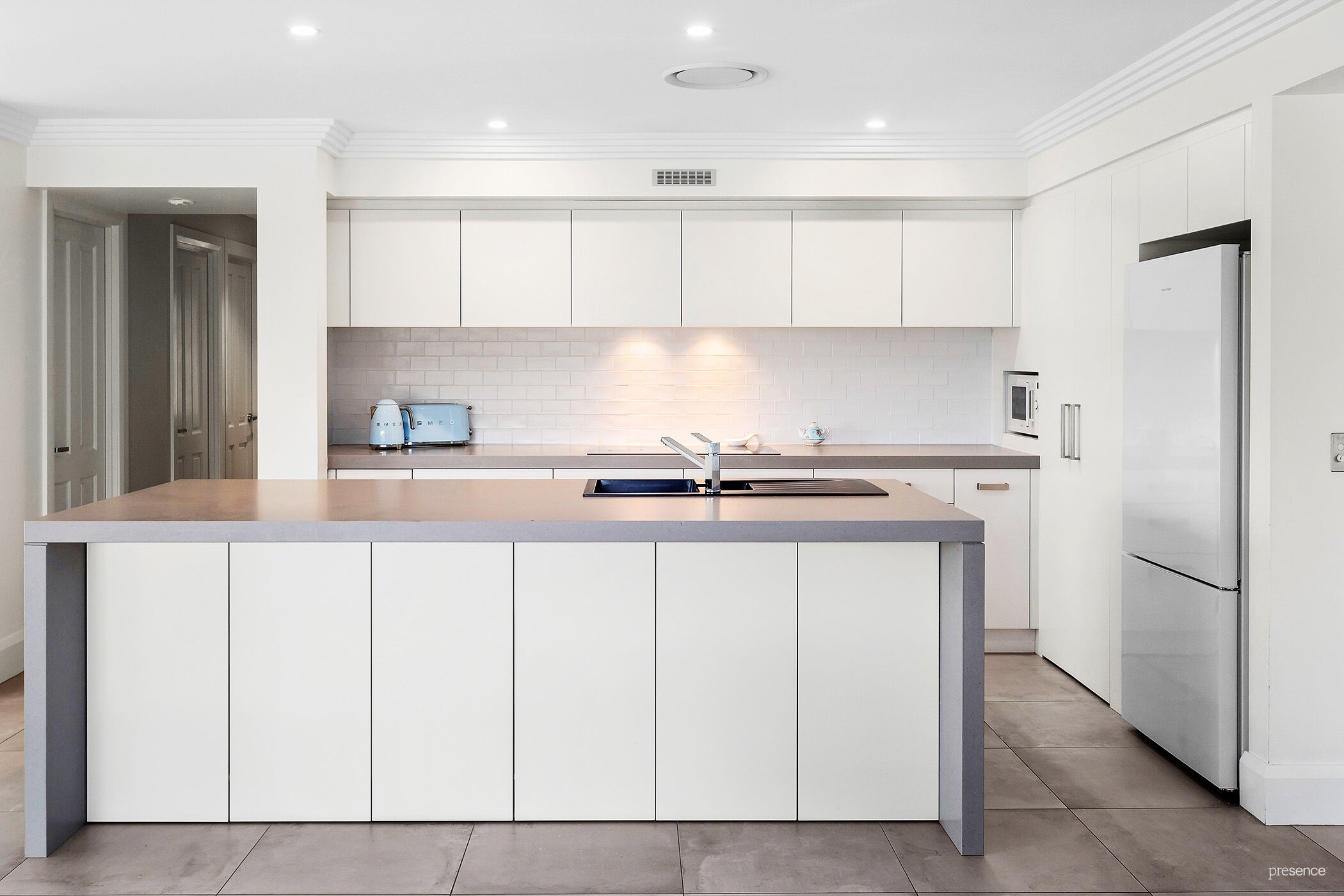 • Kitchen with large island Caesarstone bench and stainless steel appliances