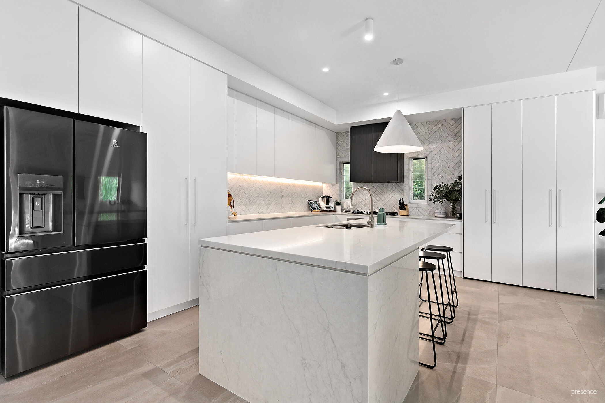 Stunning kitchen and custom joinery by Active Kitchens, Miele dishwasher, 900mm Smeg gas cooktop and oven, stone benchtops with waterfall edges, herringbone marble tiled splashback