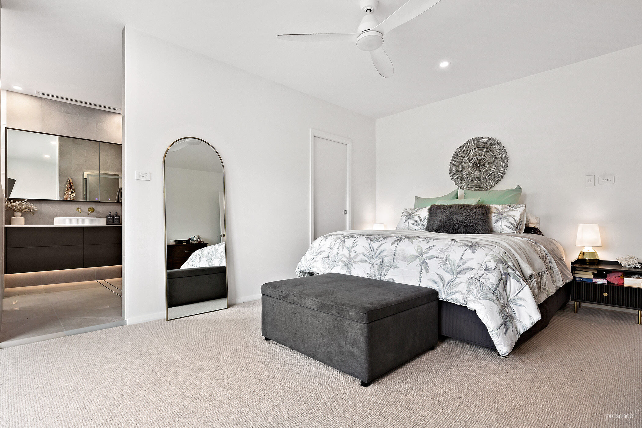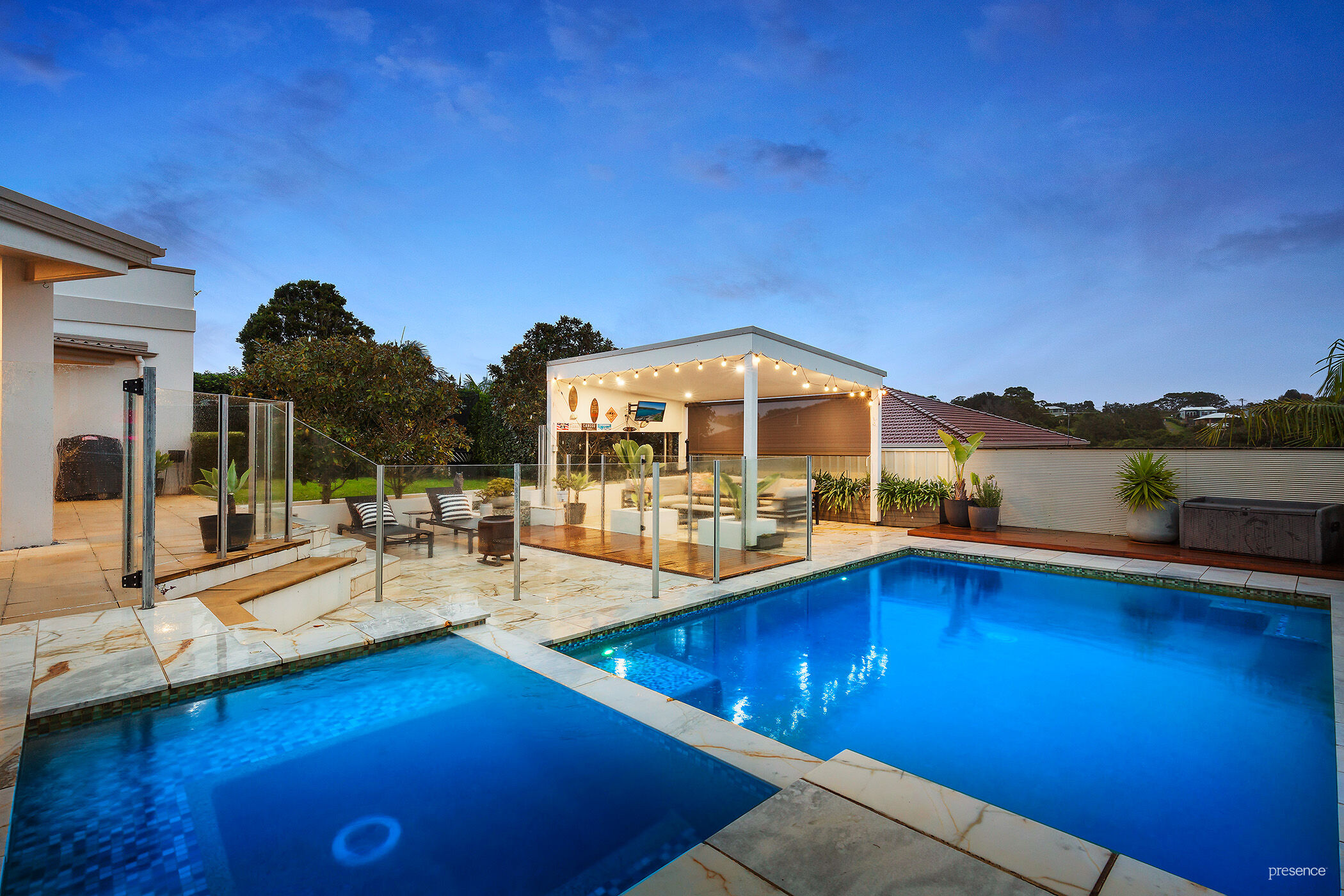 The stunning chef’s kitchen is sheer perfection with its huge island, appliance cupboard/cocktail bar, plumbing for fridge, and Smeg cooking appliances. Forming the social heart of the home, this where cups of tea, homework and family chats will be carried out, and when it comes to entertaining, your alfresco and cabana will be hard to resist along with a saltwater pool and spa that sparkles in the north-easterly sunshine.