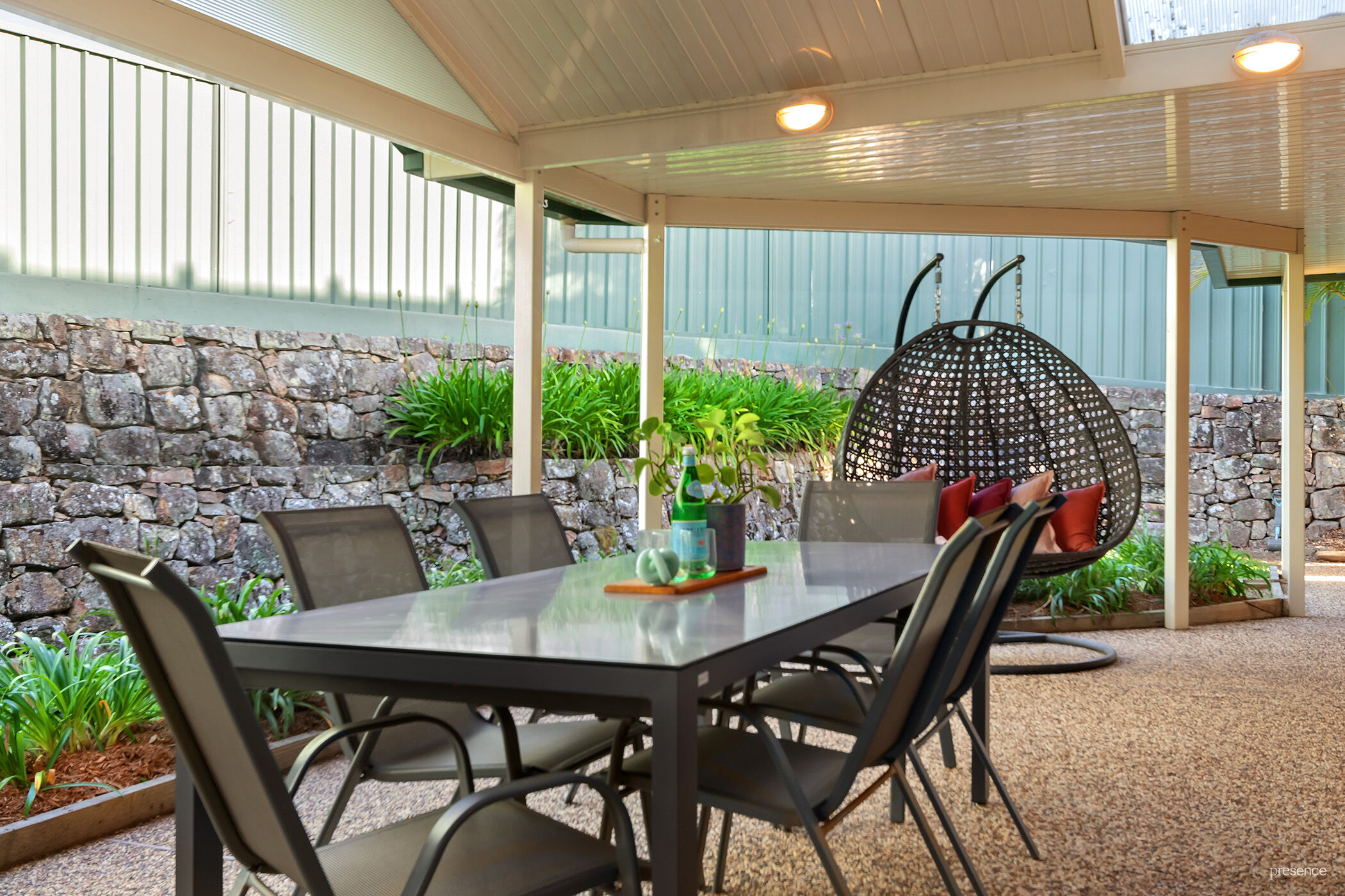 Covered alfresco entertaining area overlooks retained lawn with shed