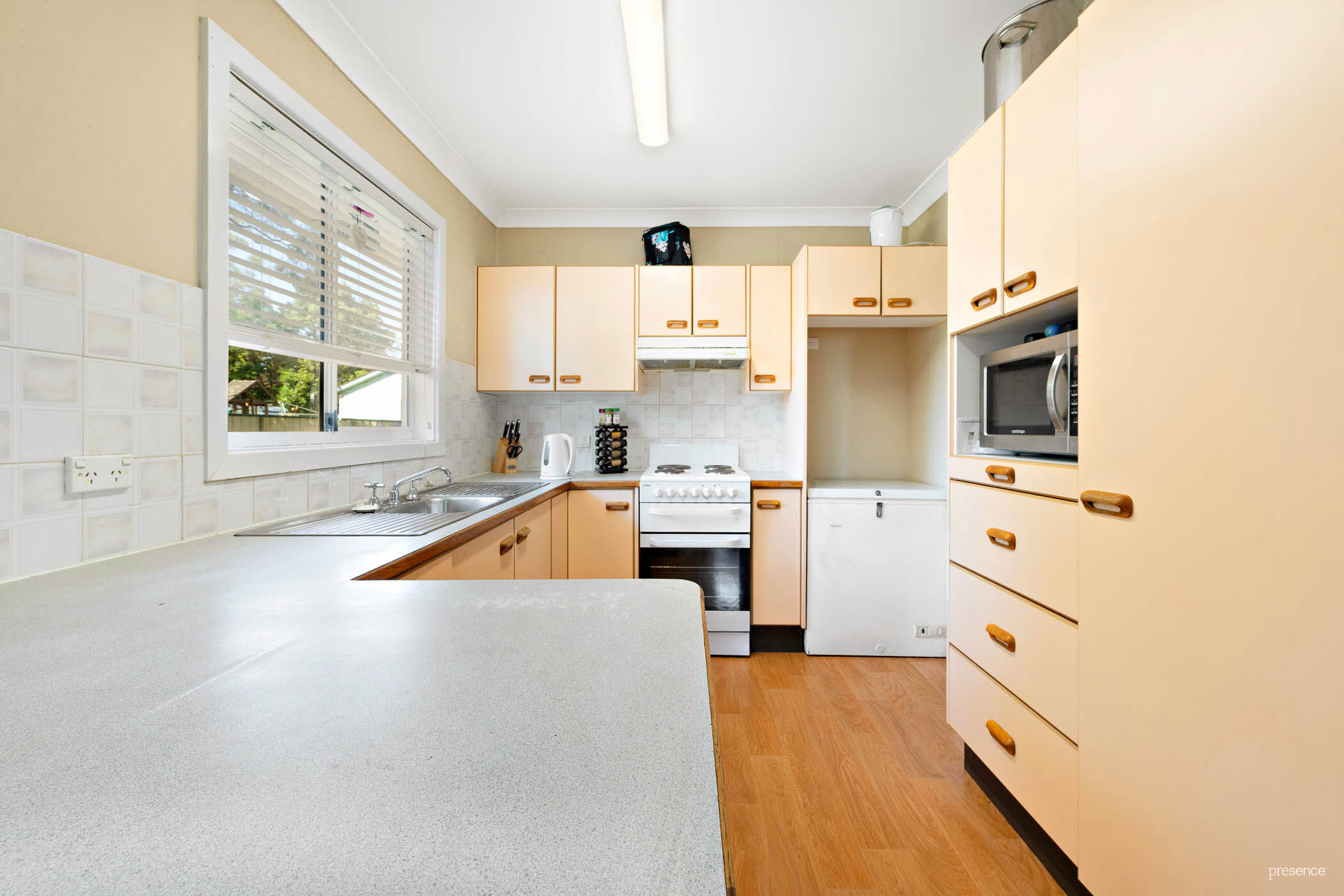 – Updated kitchen with plenty of cupboard and benchspace overlooks the backyard for easy supervision of kids at play.