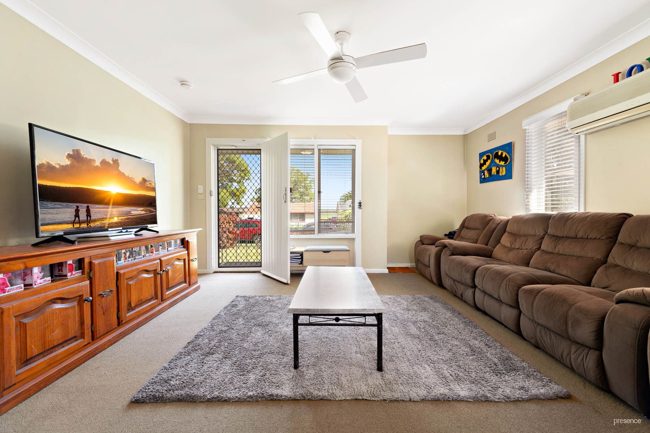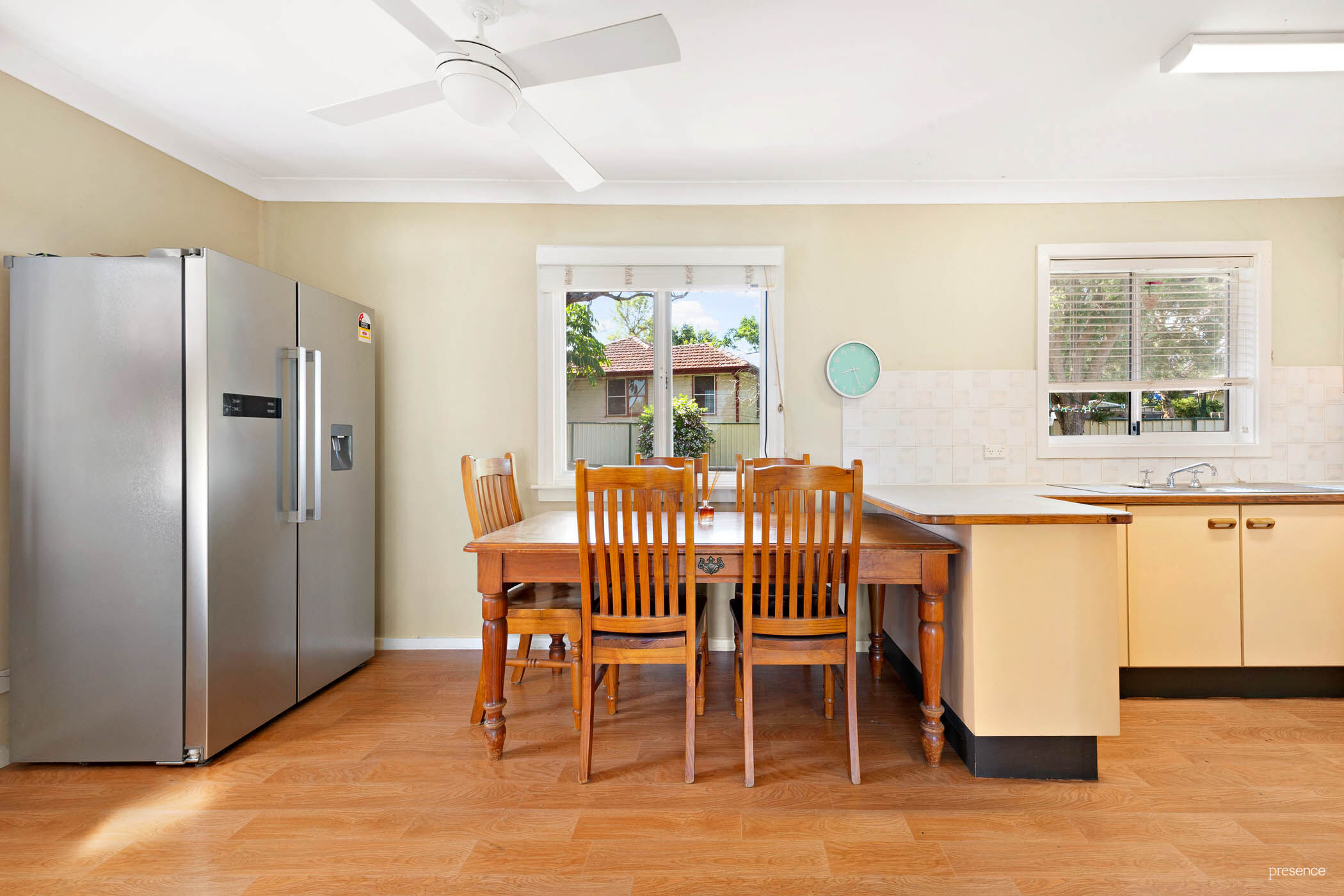 Inside, the home reveals a spacious north-east facing lounge with AC and fan, offering plenty of room for entertaining family and friends. Adjacent, a functional kitchen with meals area has a great view of the backyard, making for easy supervision of children at play.