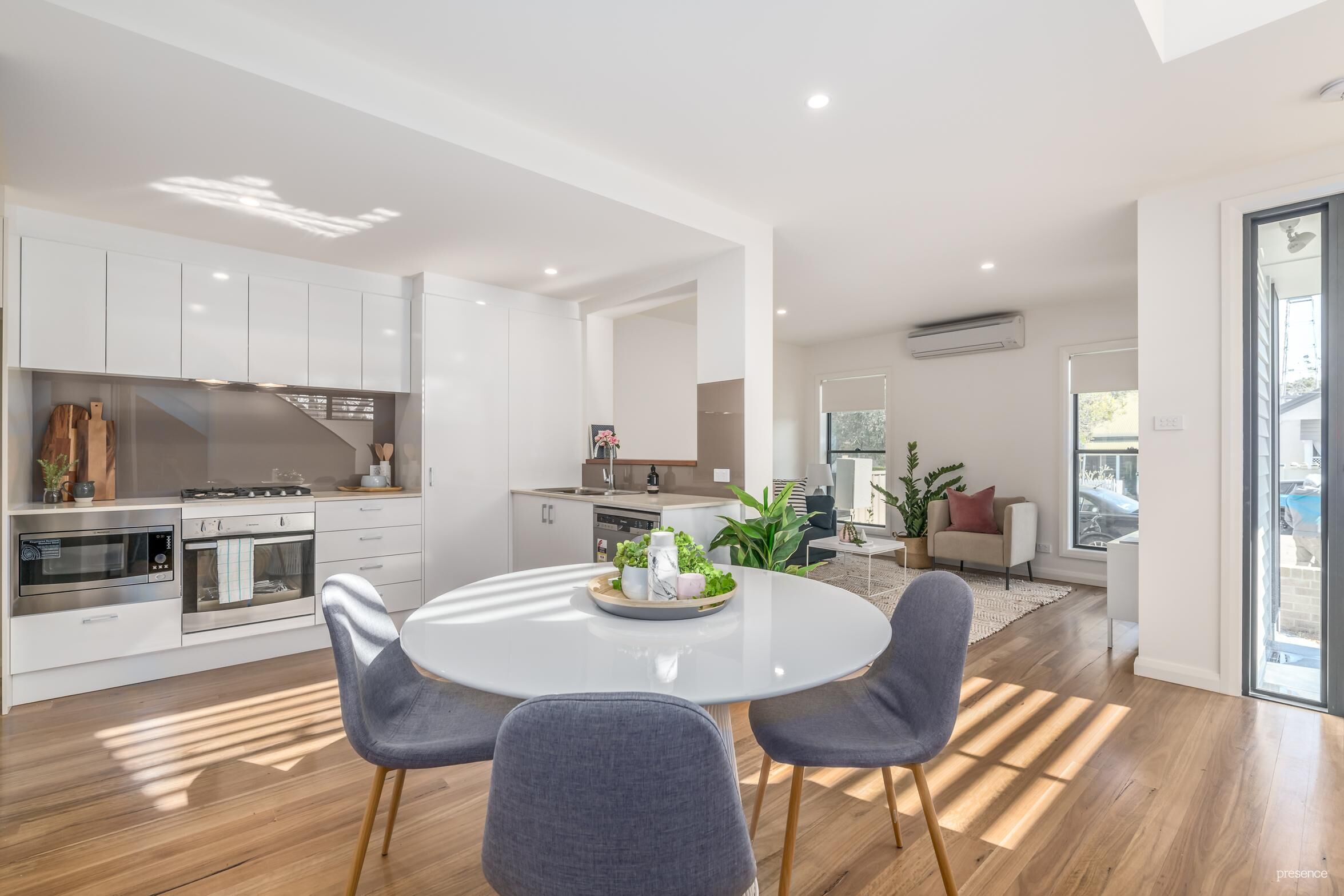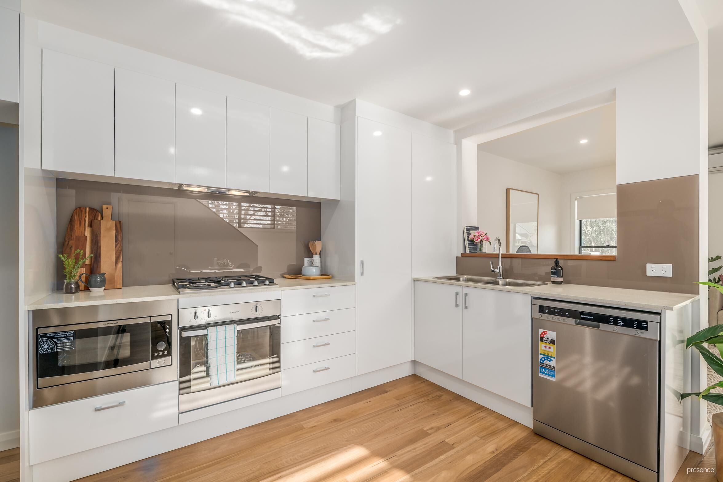 Featuring its own street frontage in a boutique setting of just two, this home offers a unique, highly functional and beautiful living environment. Its multi-level design showcases an open plan layout framed by timber floors, air-conditioning and louvre windows that allow light and breezes to fill every corner. The contemporary kitchen is fitted with a suite of Westinghouse appliances and finished with stone benchtops, while the adjoining laundry encompasses a third bathroom. Three air-conditioned bedrooms and two sleek bathrooms are staged over a split-level layout upstairs where a balcony and pleasant district and rooftop views can be enjoyed.