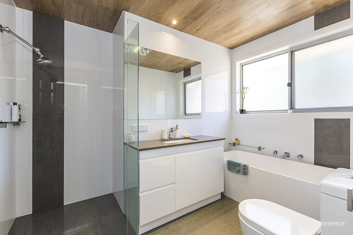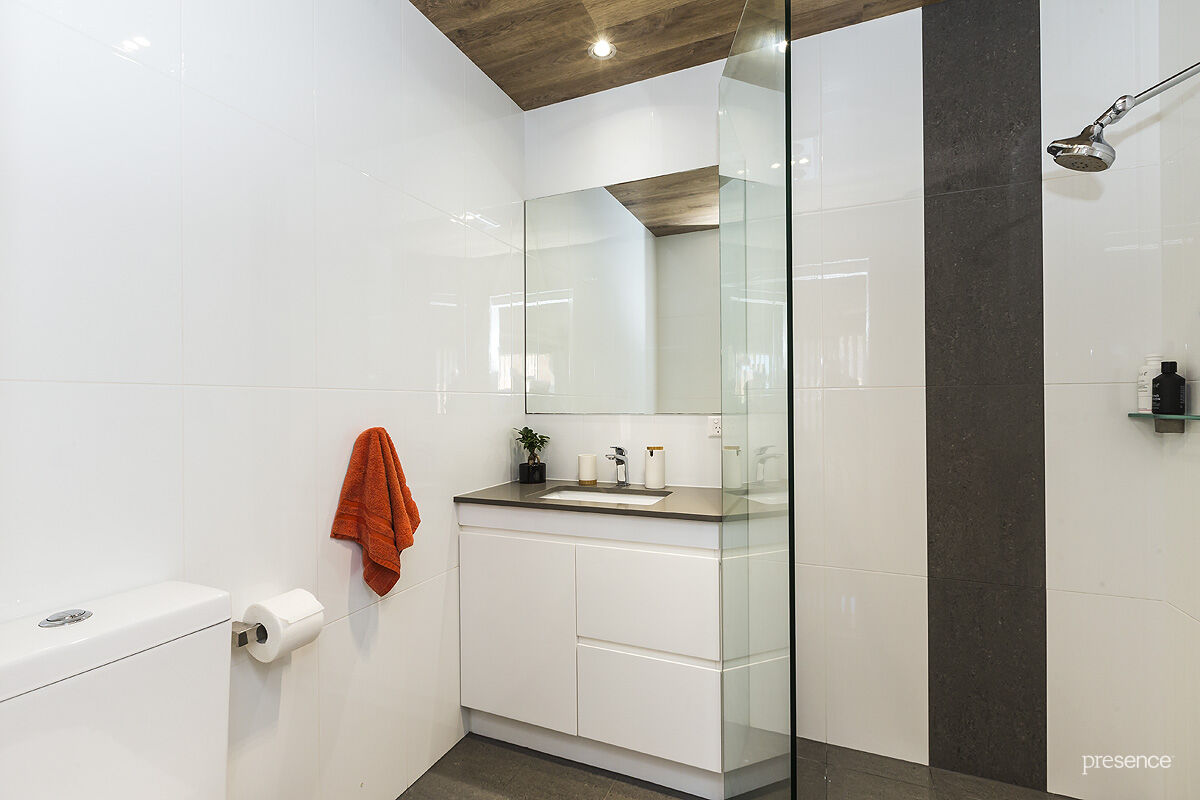 40mm benchtops, 2-pac polyurethane cupboards, glass splashback and quality European cooking appliances. And like the kitchen, the two bathrooms and laundry/powder room are well-designed and beautifully appointed with frameless showers, timber lined ceilings and floor to ceiling tiling. Ducted air-conditioning, a single garage accessed internally and visitor’s parking mean every convenience has been considered.