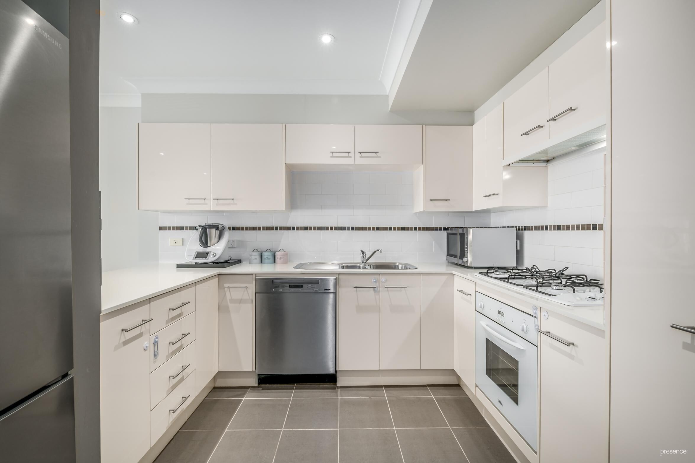 – Modern kitchen with stone benches, gas cooktop and Miele dishwasher