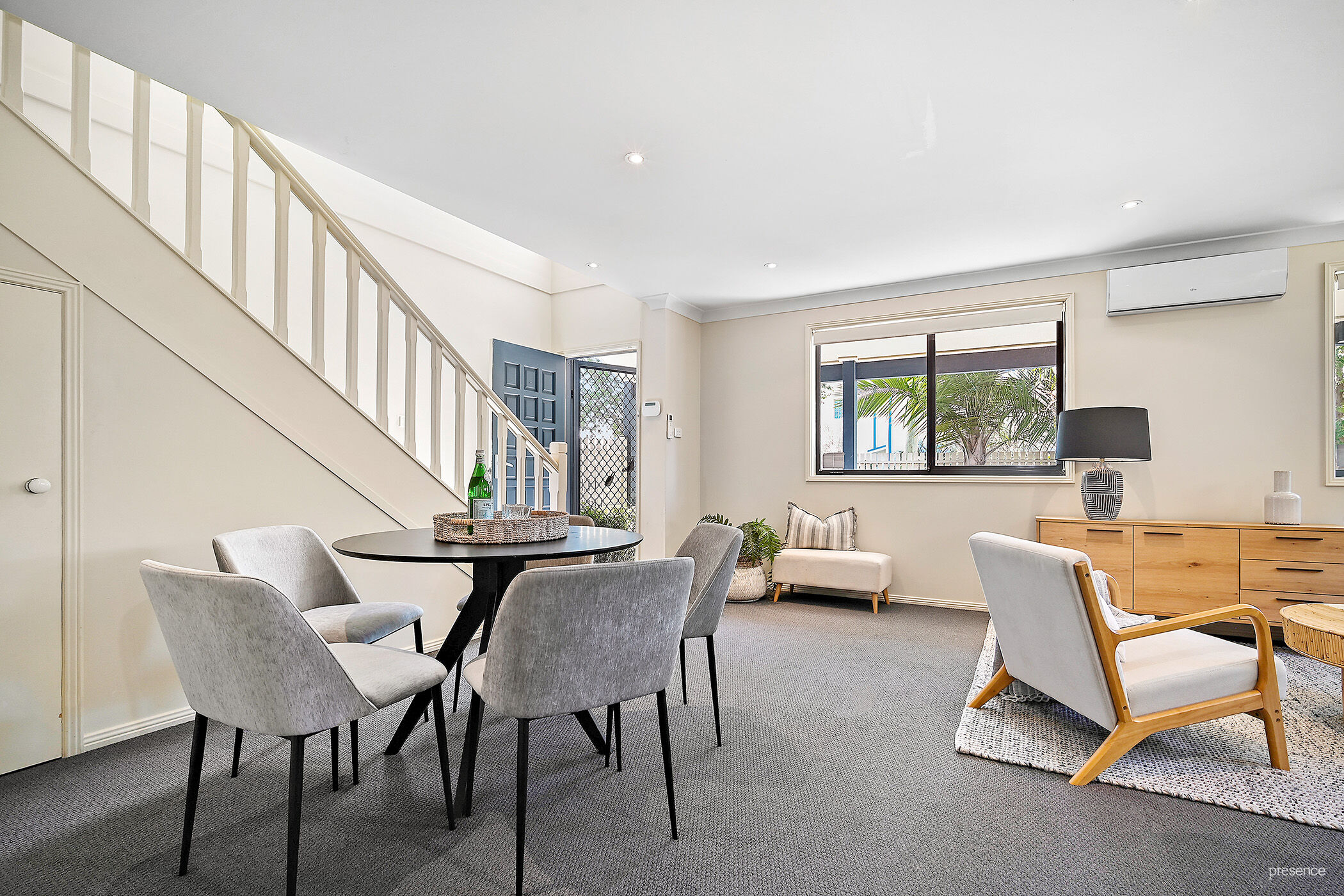 Positioned within a small complex of only four, the property features a spacious, light-filled living area that flows into the dining space and a functional kitchen with a breakfast bar.