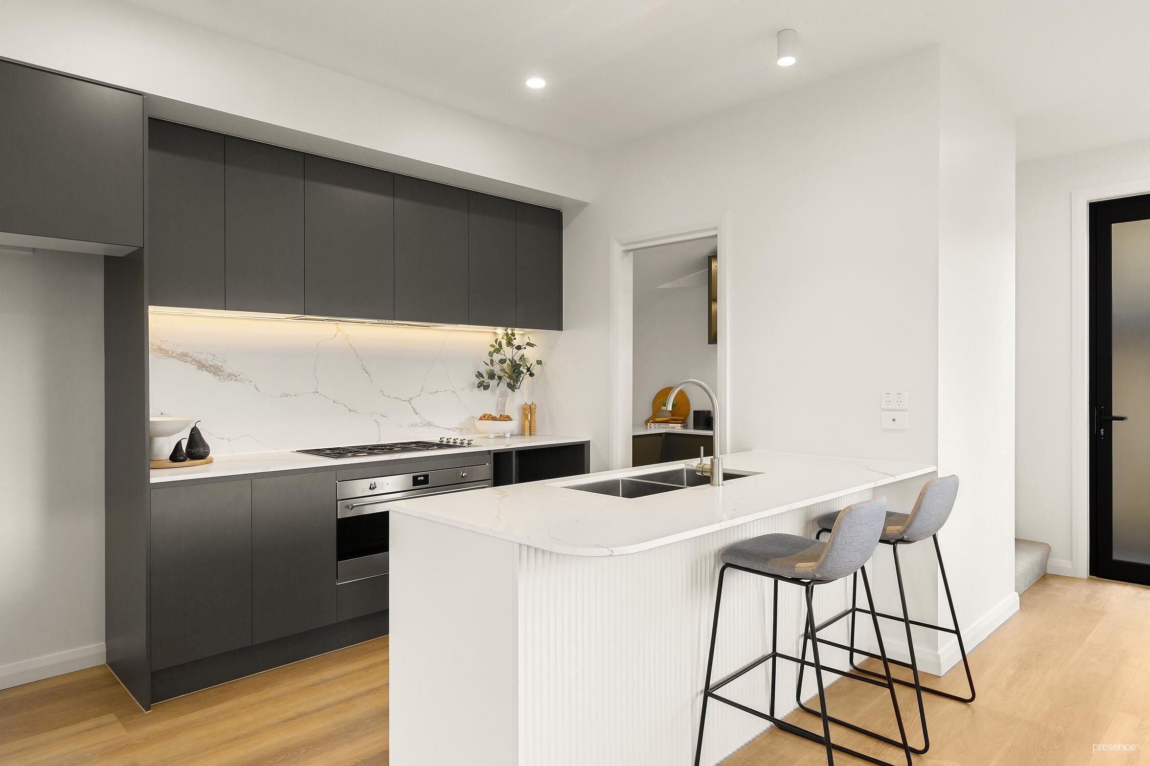 Step inside and be greeted by a sun-soaked open-plan living space that instantly feels like home. Designed for both entertaining and laid-back family life, this seamless layout showcases crisp lines, high-end finishes, and a palpable sense of style. At its heart is a gleaming chef’s kitchen, complete with a sleek butler’s pantry, sumptuous stone benchtops, and a full suite of premium appliances. Whether you’re prepping a midweek dinner or hosting a long lunch, this space makes cooking a delight.