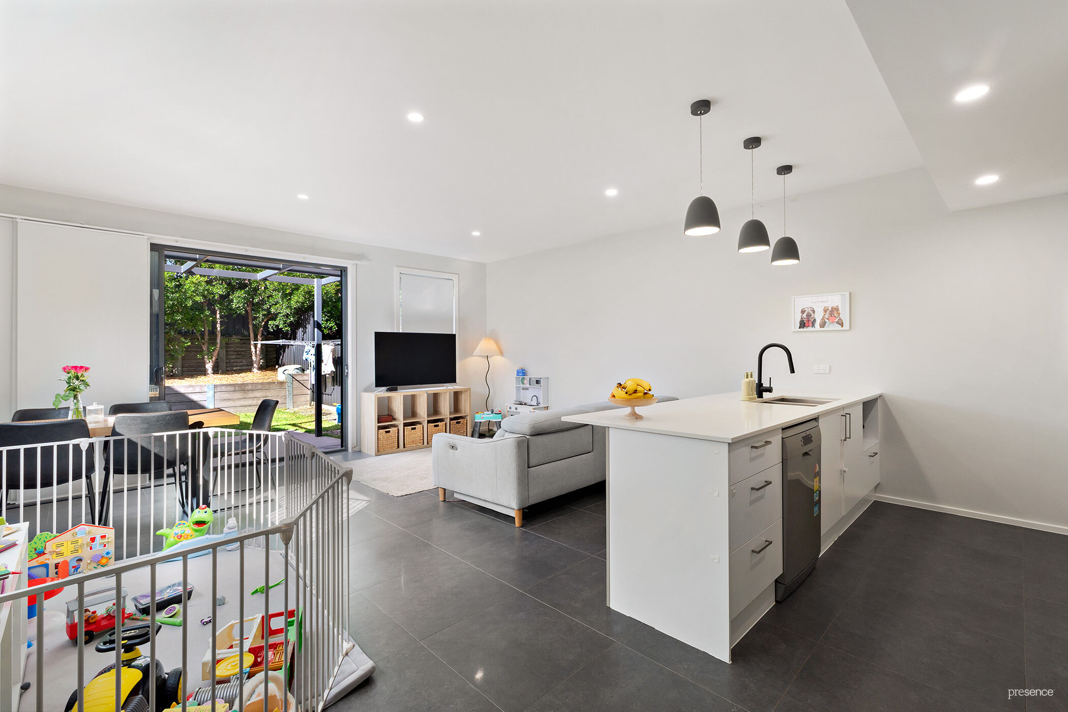 The custom stone-topped kitchen is truly the highlight, offering ample storage with wide drawers and a pantry, plus an ideal vantage point over the yard so you can keep an eye on all the action while whipping up your favourite meals. Entertaining is effortless as guests flow seamlessly from indoors to your private outdoor haven.