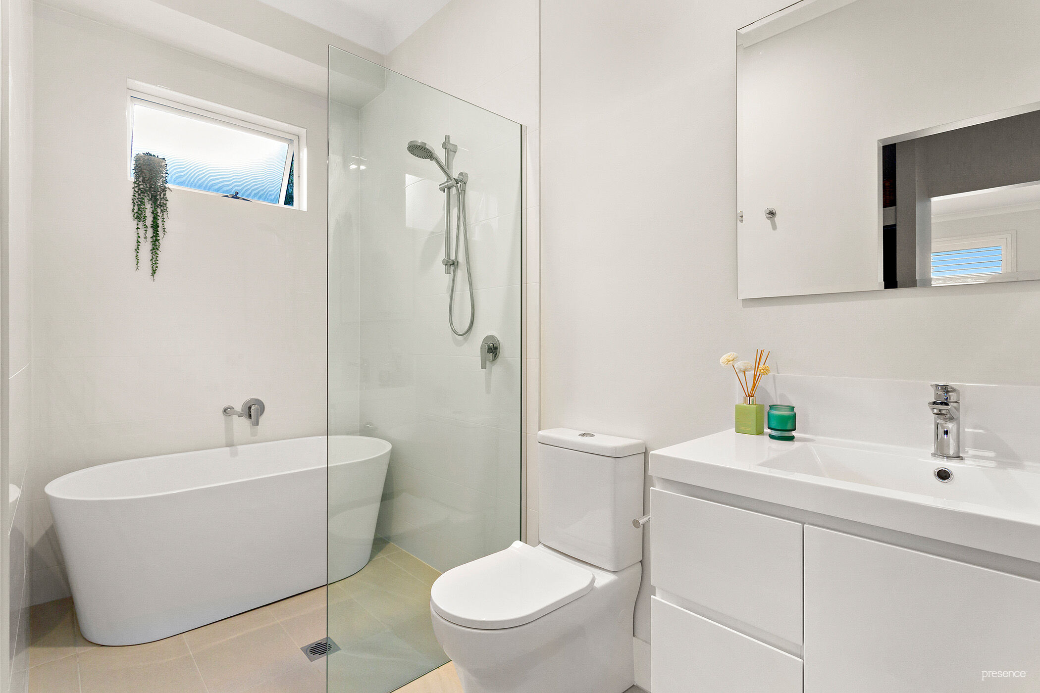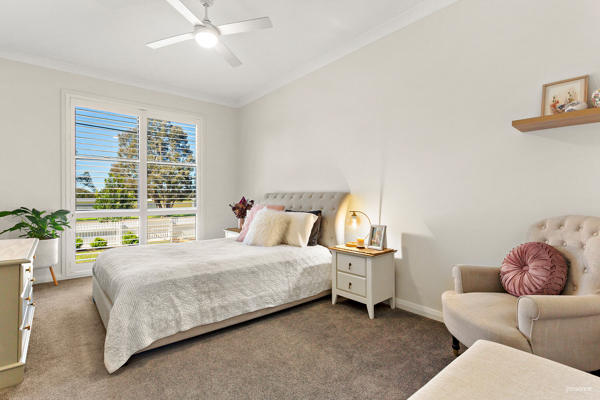 On entering, you’ll find a spacious ground-floor master (or guest suite) overlooking the park, complete with a split system, a walk-in robe, and its own ensuite featuring a luxurious freestanding bath. A further two bedrooms await upstairs, including an additional master bedroom with private ensuite plus walk-in robe, and a third bedroom with a built-in robe. Each of the bedrooms are equipped with ceiling fans and plantation shutters, ensuring comfort, and adding a touch of elegance.