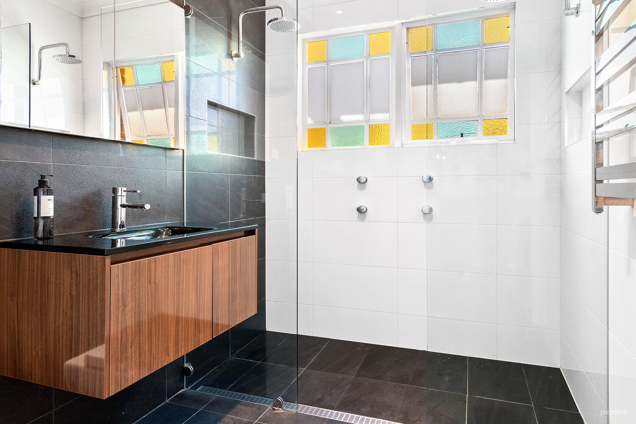– Two striking bathrooms with sleek black vanities, main with double shower