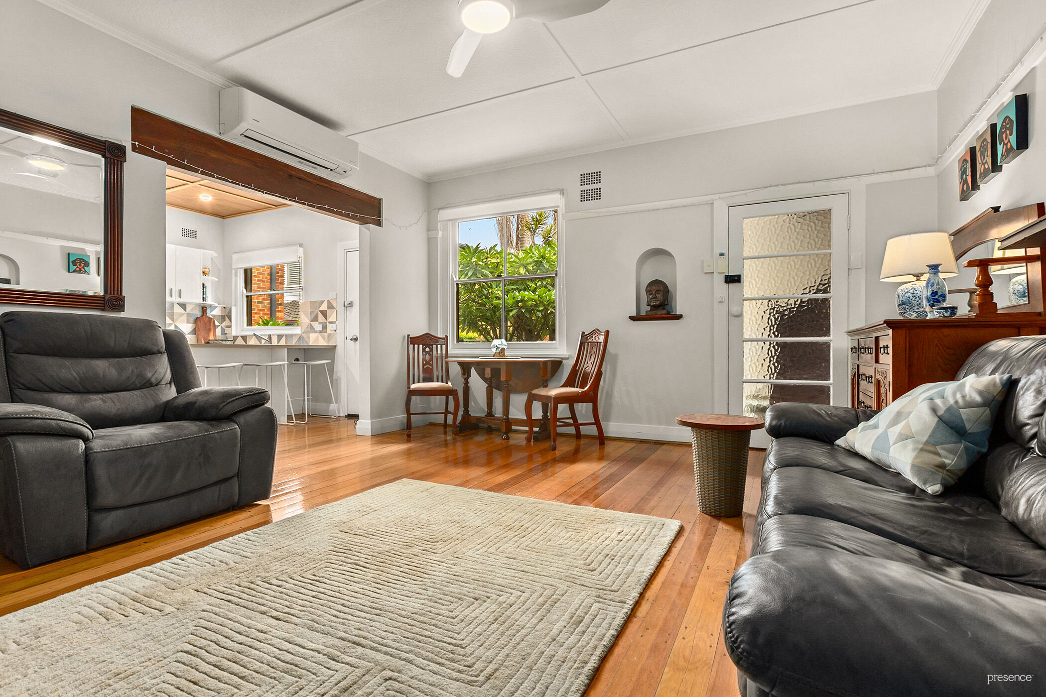 – Back door access to leafy courtyard and shared laundry, storage shed