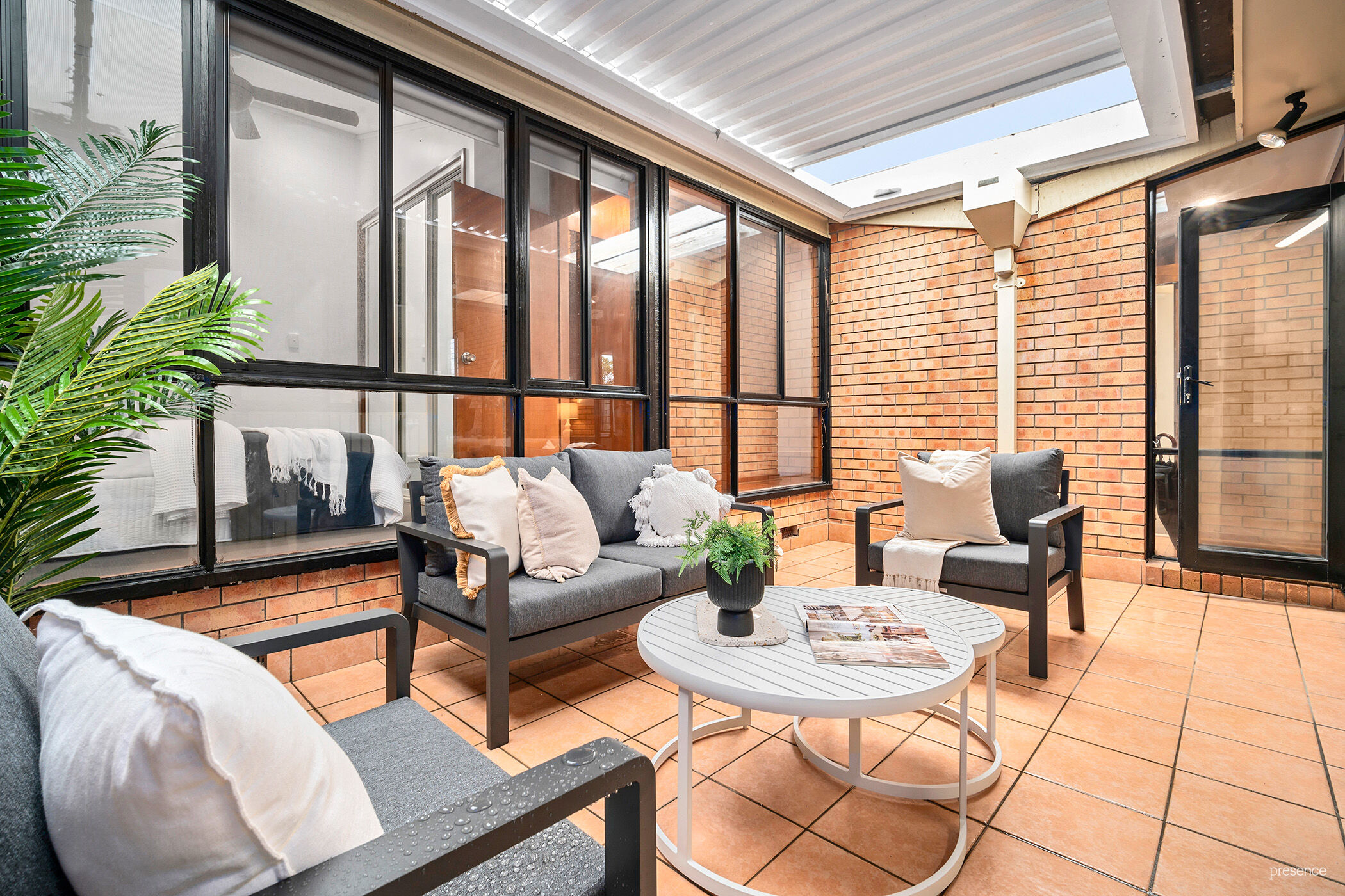 For entertaining, the all-weather entertainment space sits conveniently across from the kitchen. Originally an internal courtyard, it is now partially enclosed, perfect for a breath of fresh air and alfresco dining. Or, when you’d rather soak in the sun, the home’s large, fully fenced backyard is the perfect place to kick back with a drink. The spacious home also boasts two generous bedrooms, each with mirrored built-in robes, a comfortable family bathroom with a water closet and a separate laundry.