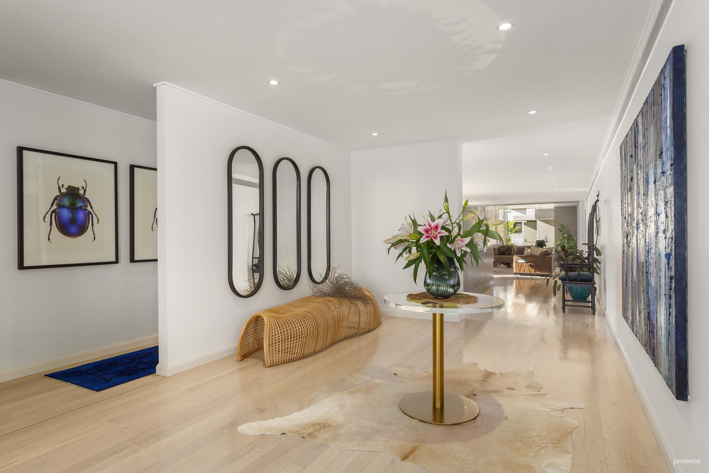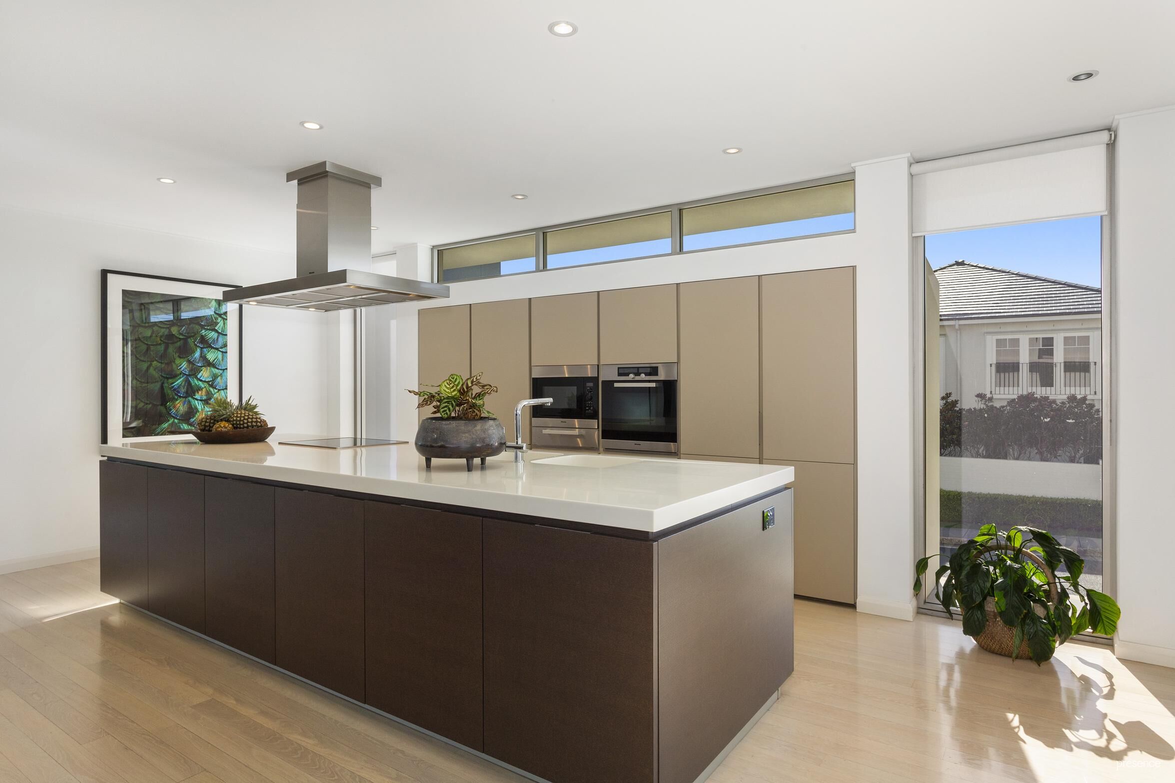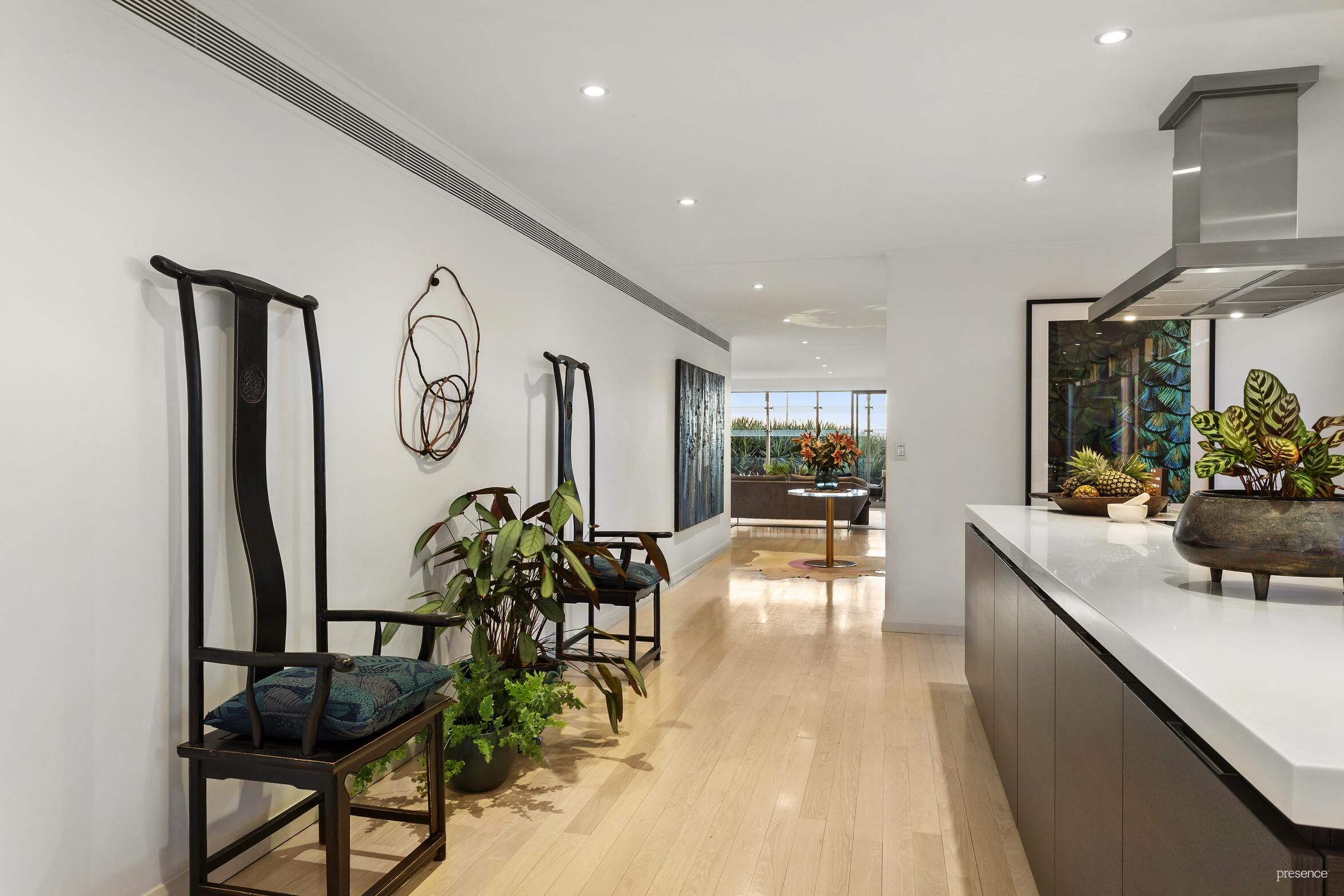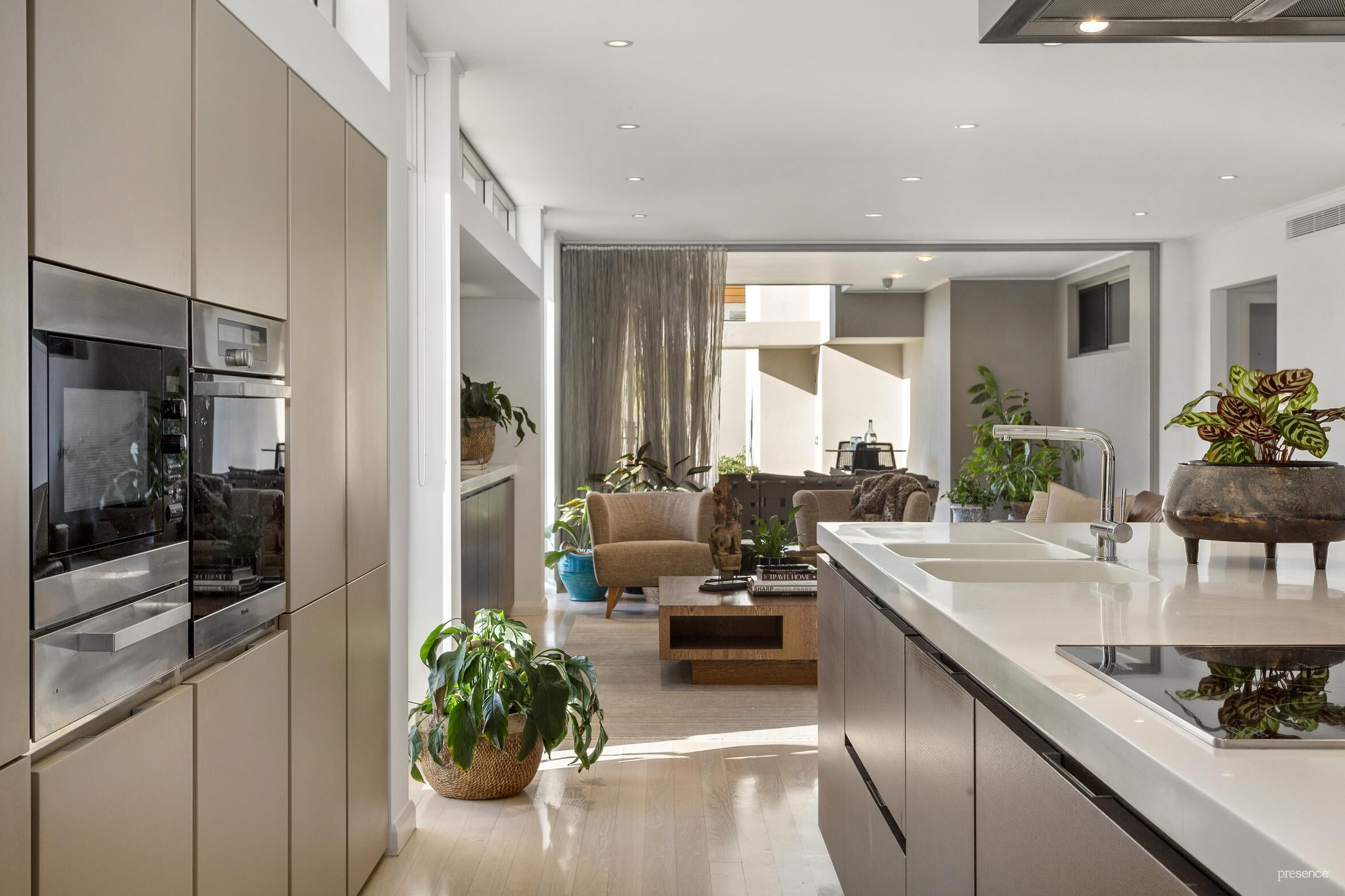 With lift access straight into the apartment, you’re welcomed into a light-filled, open-plan layout. Floor-to-ceiling glass and louvre windows invite the sea breeze in, while lime-washed timber floors bring a relaxed, elegant vibe. The front balcony, fitted with underfloor heating, offers views through dragon trees to the ocean beyond. At the rear, bi-fold doors peel back to open the family room to a private outdoor space that’s perfect for entertaining or simply unwinding.