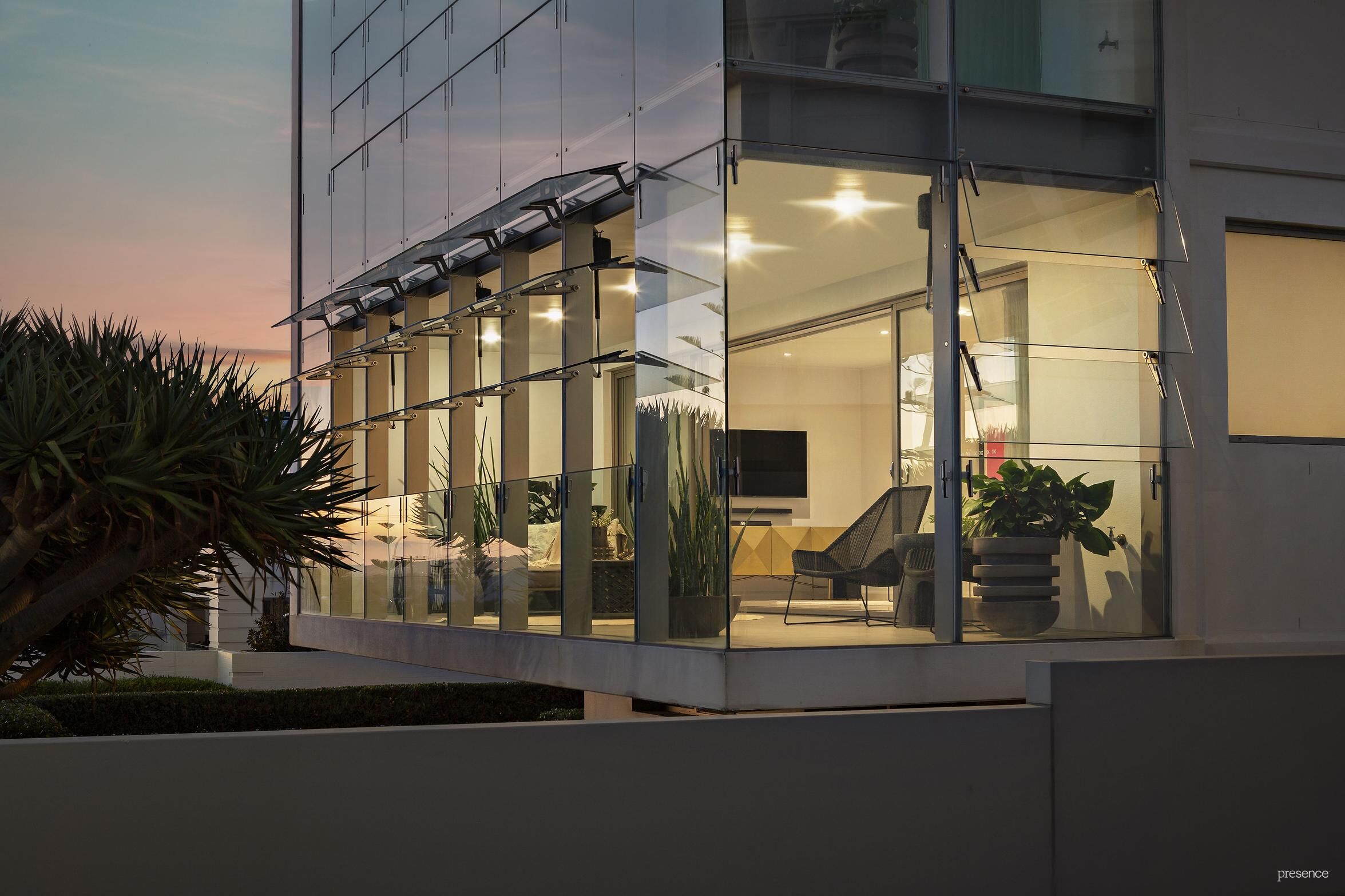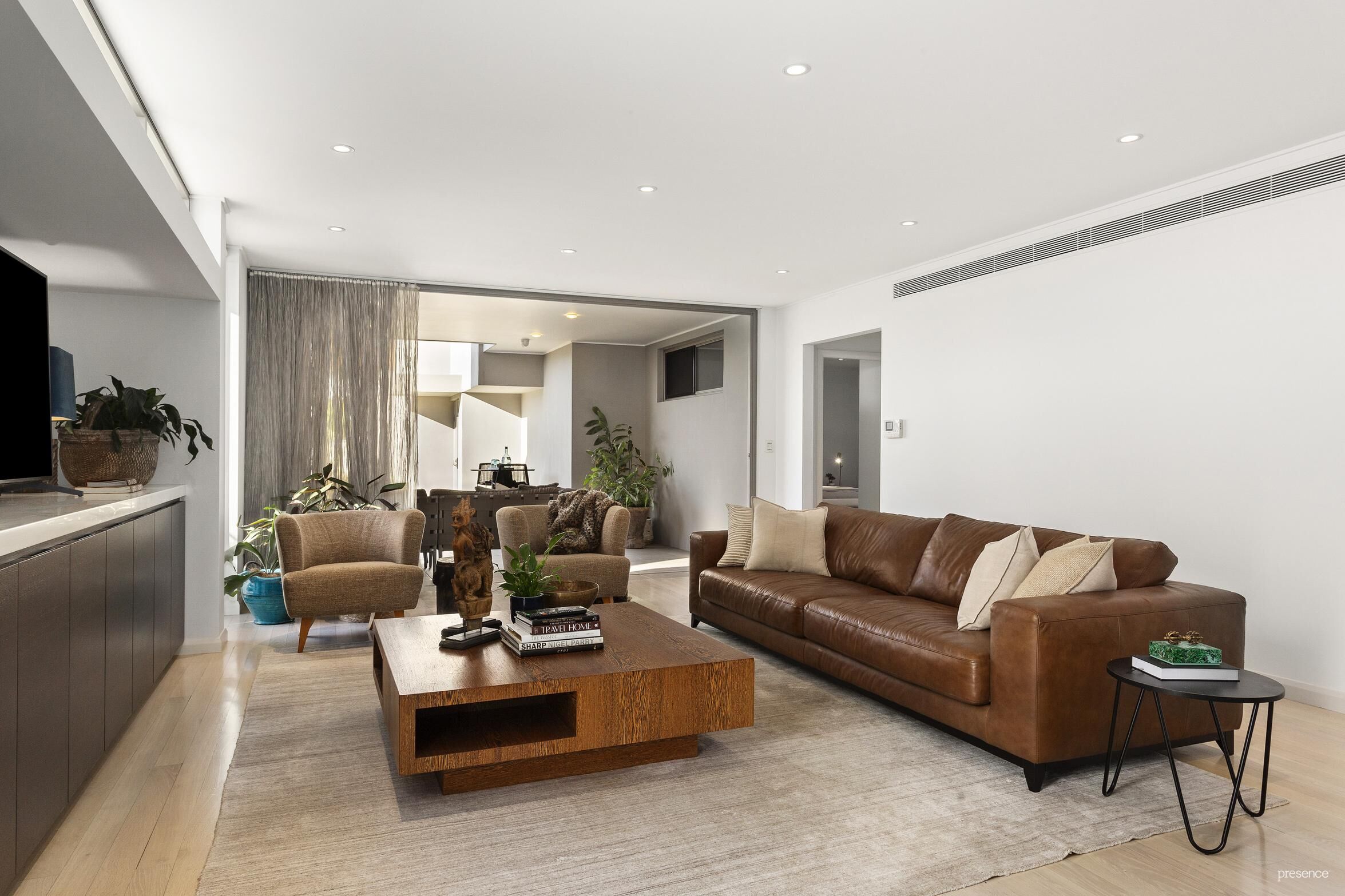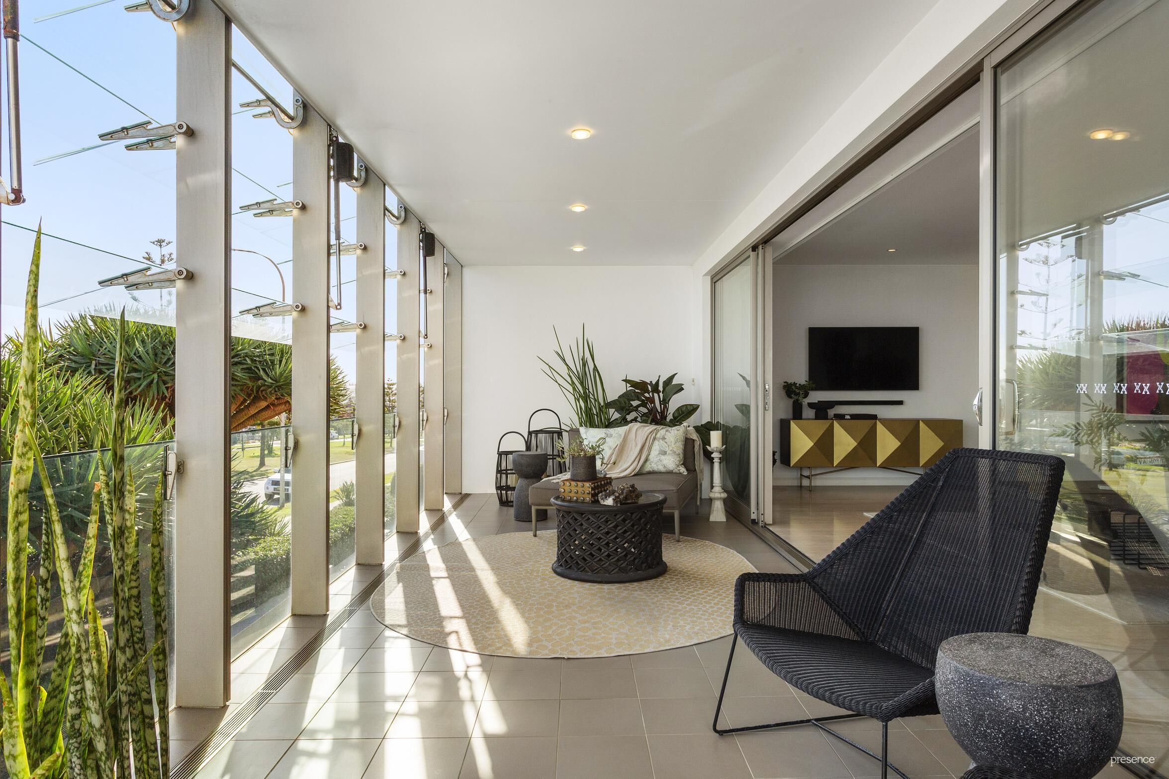 With lift access straight into the apartment, you’re welcomed into a light-filled, open-plan layout. Floor-to-ceiling glass and louvre windows invite the sea breeze in, while lime-washed timber floors bring a relaxed, elegant vibe. The front balcony, fitted with underfloor heating, offers views through dragon trees to the ocean beyond. At the rear, bi-fold doors peel back to open the family room to a private outdoor space that’s perfect for entertaining or simply unwinding.
