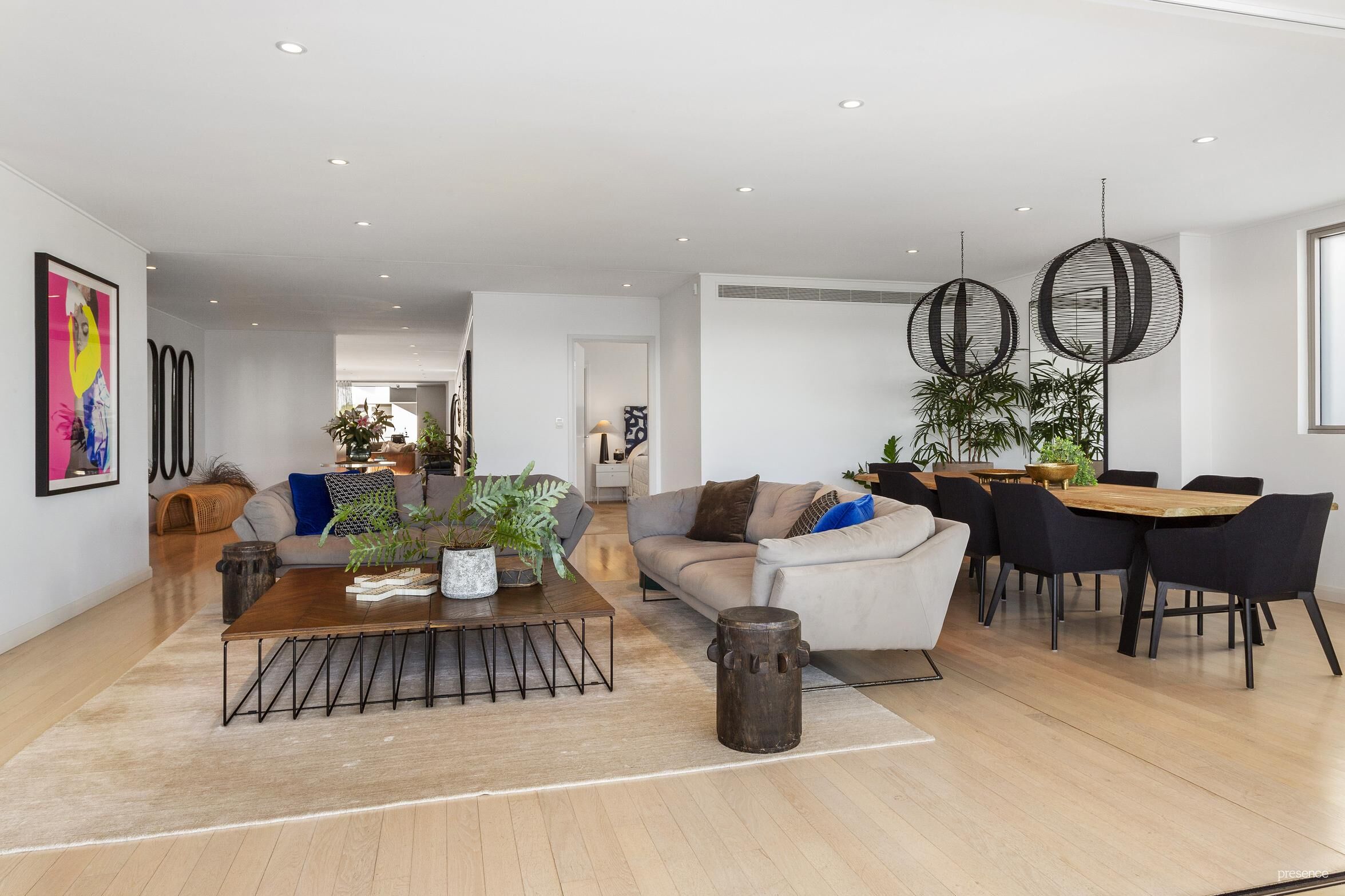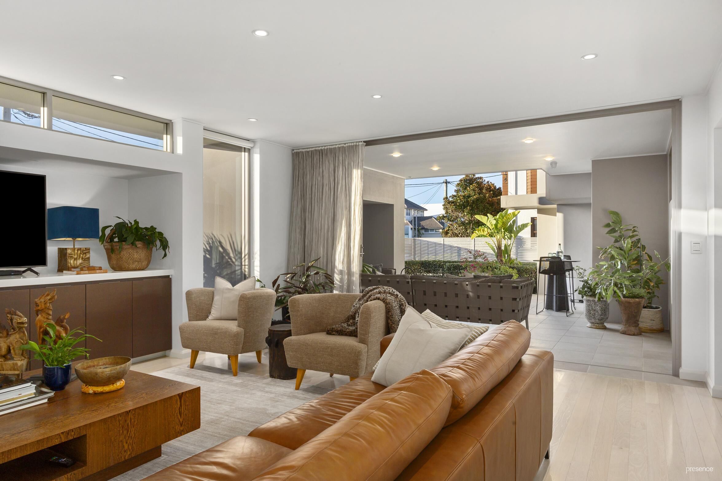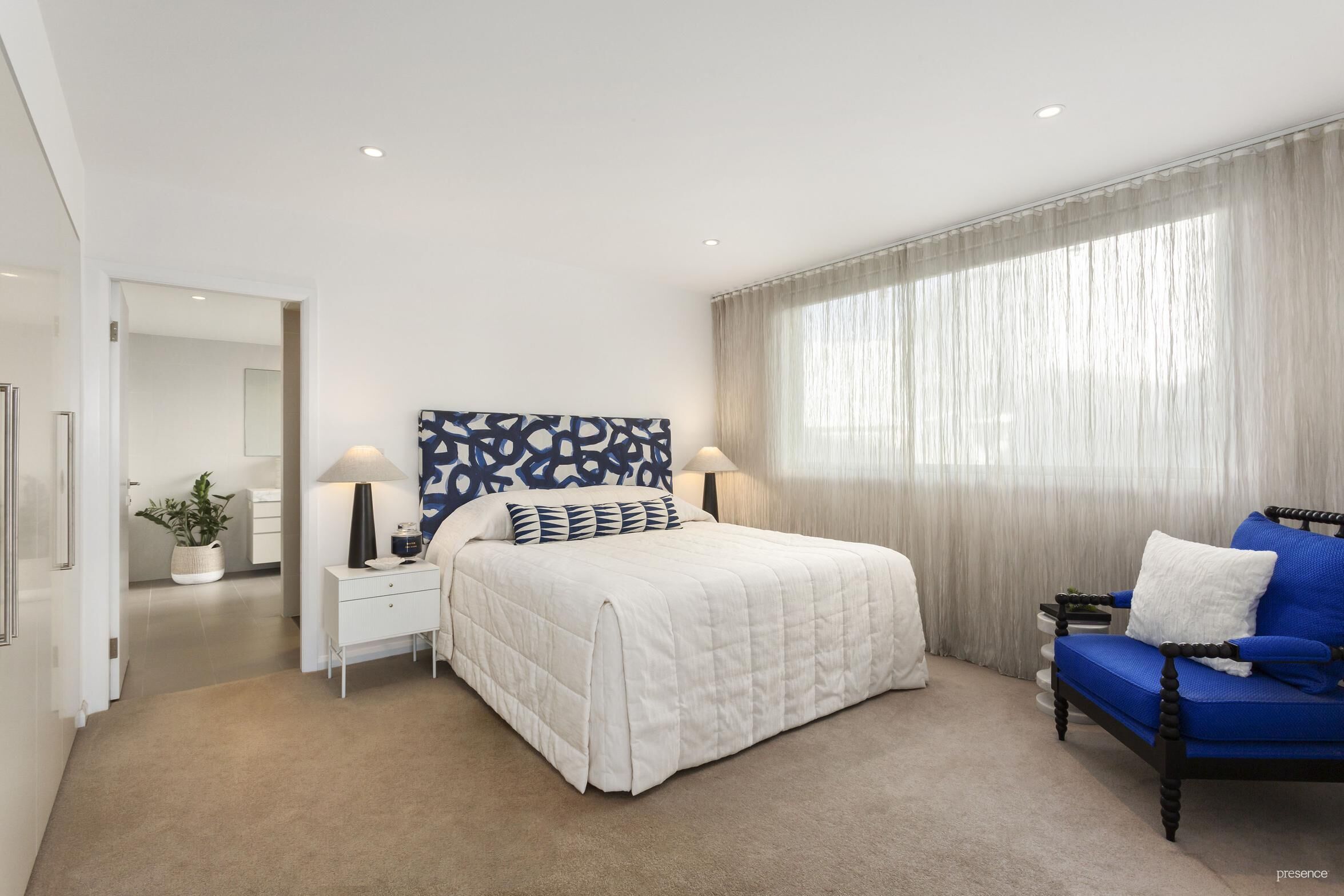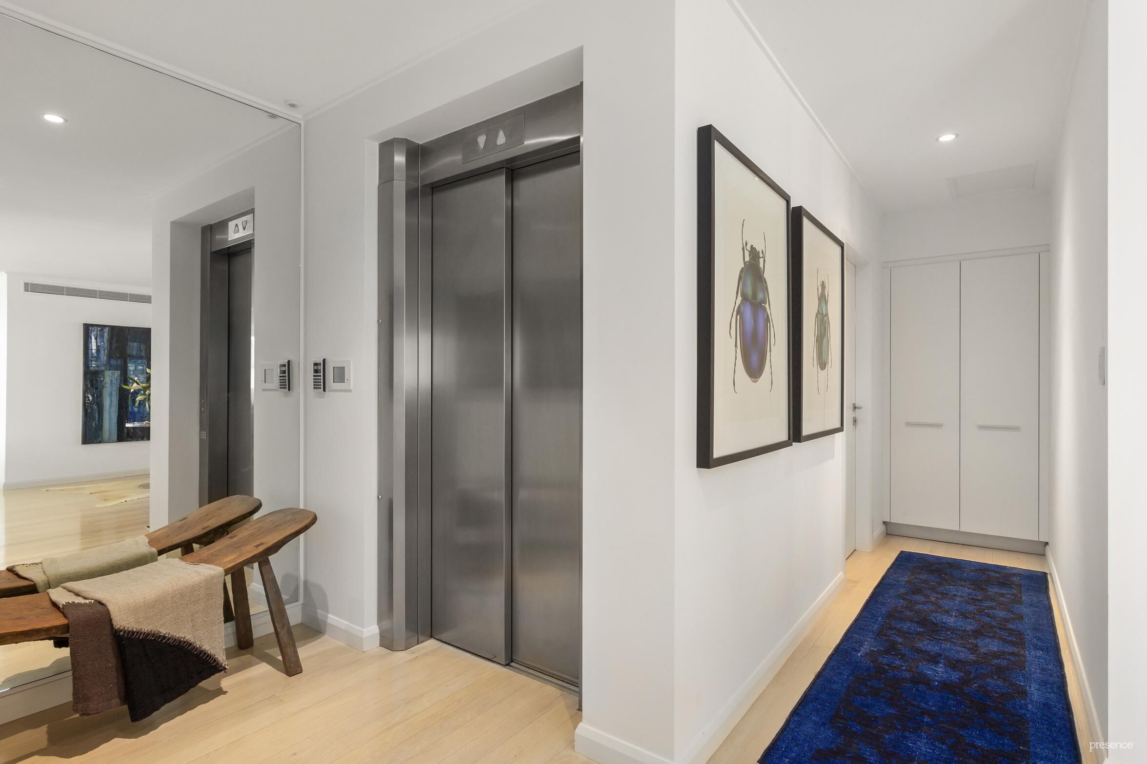 With lift access straight into the apartment, you’re welcomed into a light-filled, open-plan layout. Floor-to-ceiling glass and louvre windows invite the sea breeze in, while lime-washed timber floors bring a relaxed, elegant vibe. The front balcony, fitted with underfloor heating, offers views through dragon trees to the ocean beyond. At the rear, bi-fold doors peel back to open the family room to a private outdoor space that’s perfect for entertaining or simply unwinding.