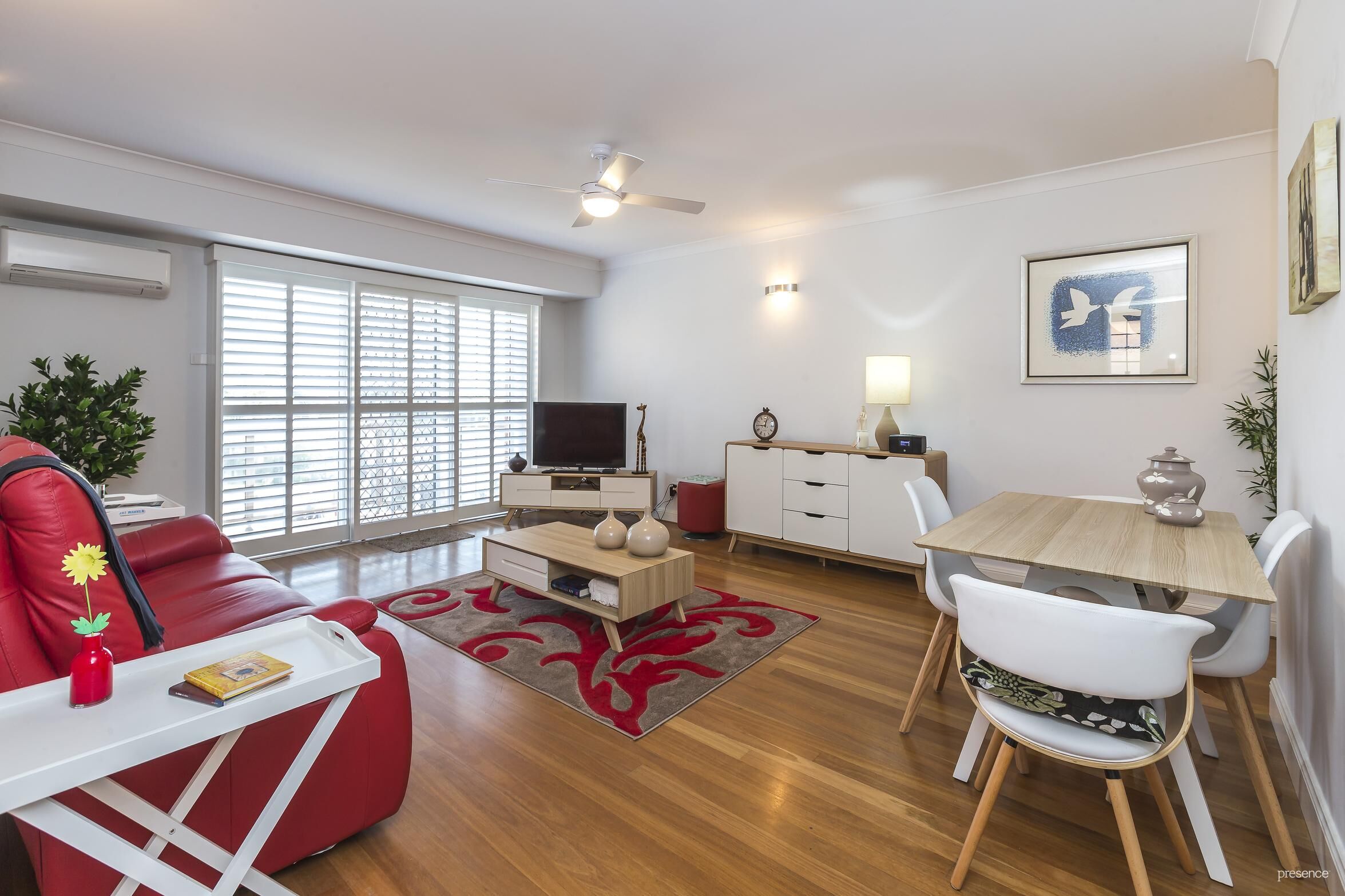 – Air-conditioned open plan living and dining with timber floors connects to balcony