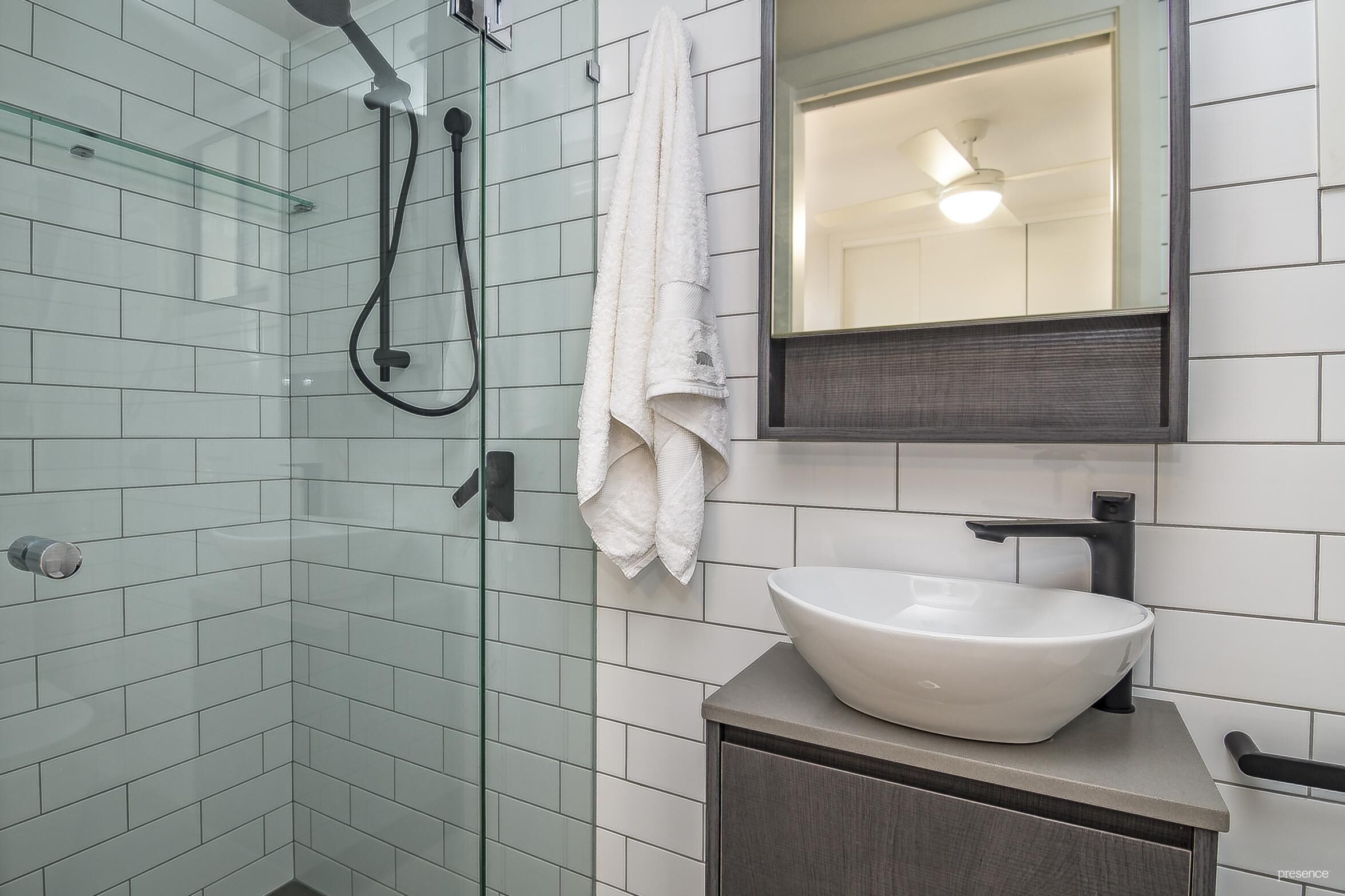 – Bathroom with large shower and Caesarstone vanity