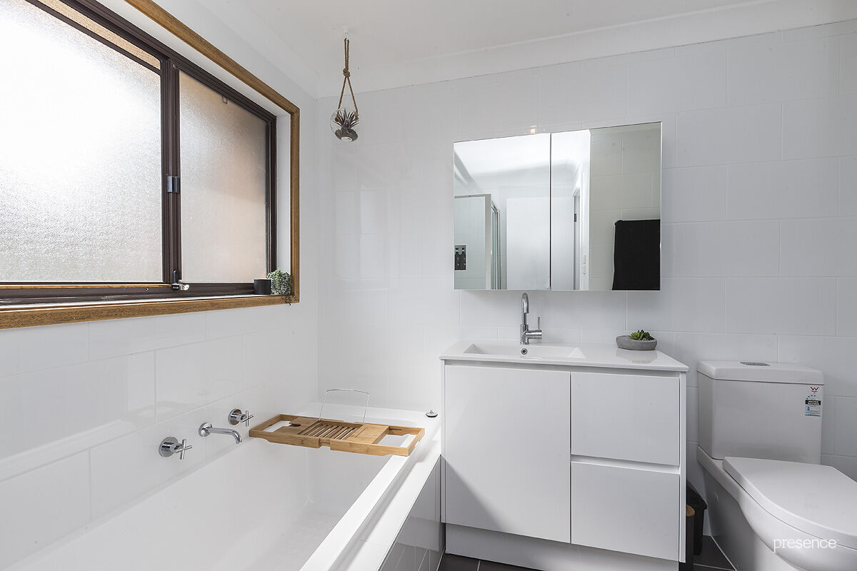 Inside, the interiors are fresh, bright and welcoming. The open floorplan allows living and dining to connect smoothly with a spacious kitchen that features electric cooking, generous meal prep and cabinet space, plus a brand new dishwasher. A new laundry/powder room completes the ground floor while upstairs, three bedrooms including a robed master surround the new bathroom where a crisp white aesthetic and floor to ceiling tiling sets a stylish scene.