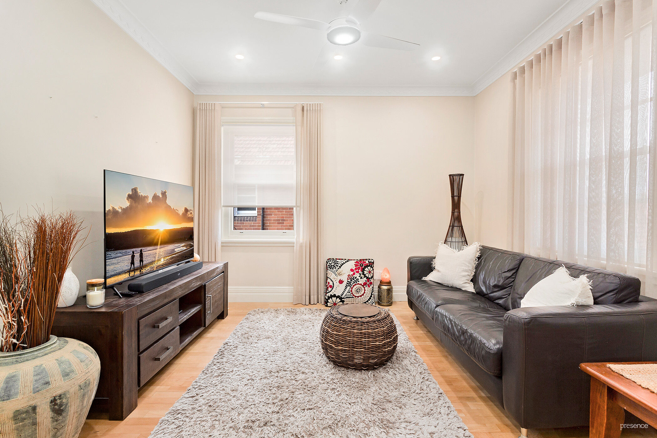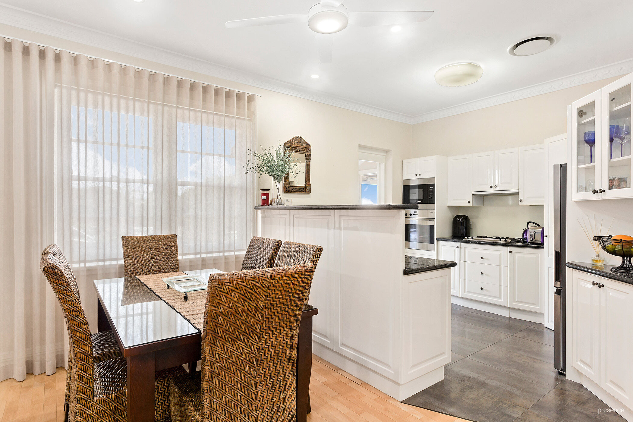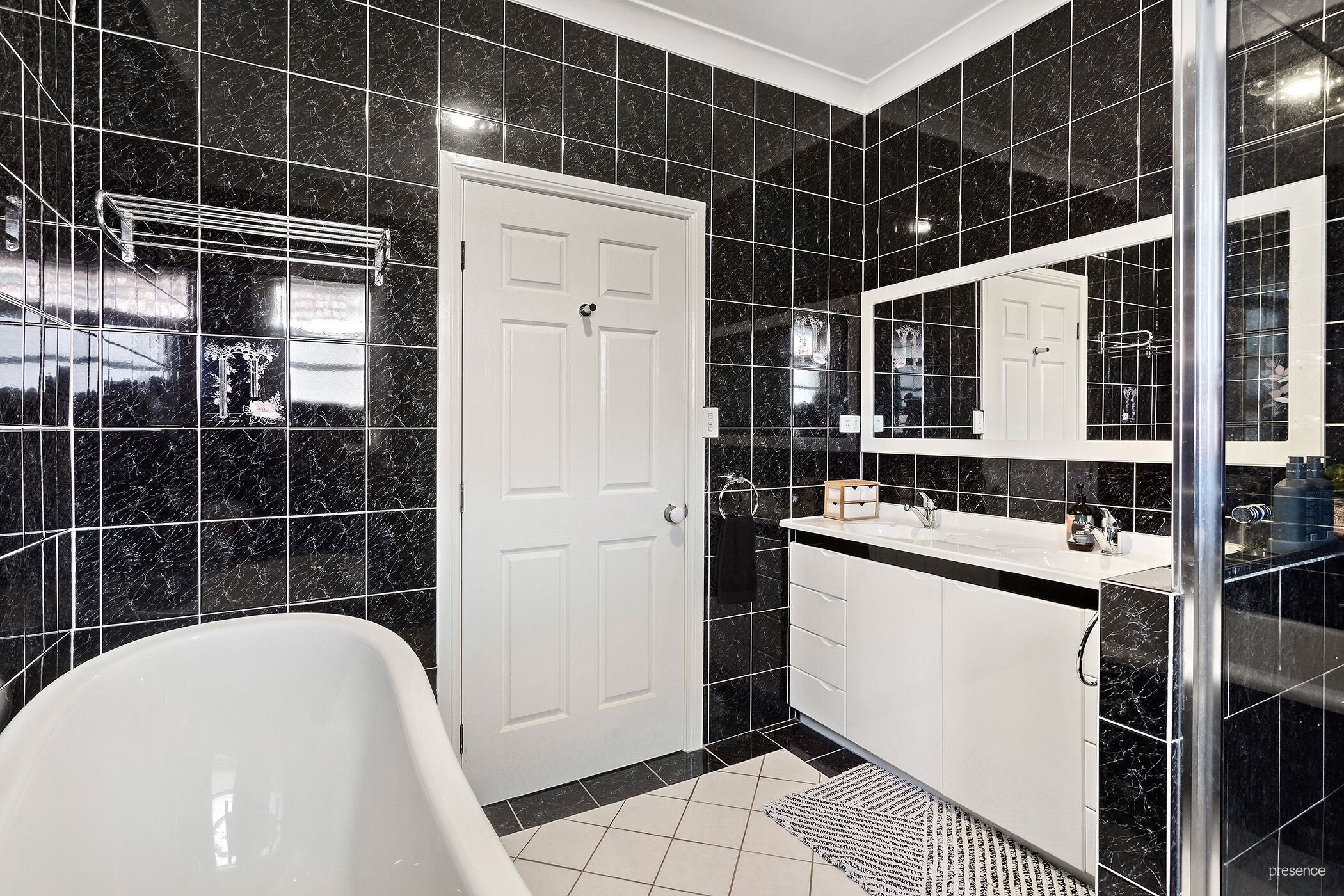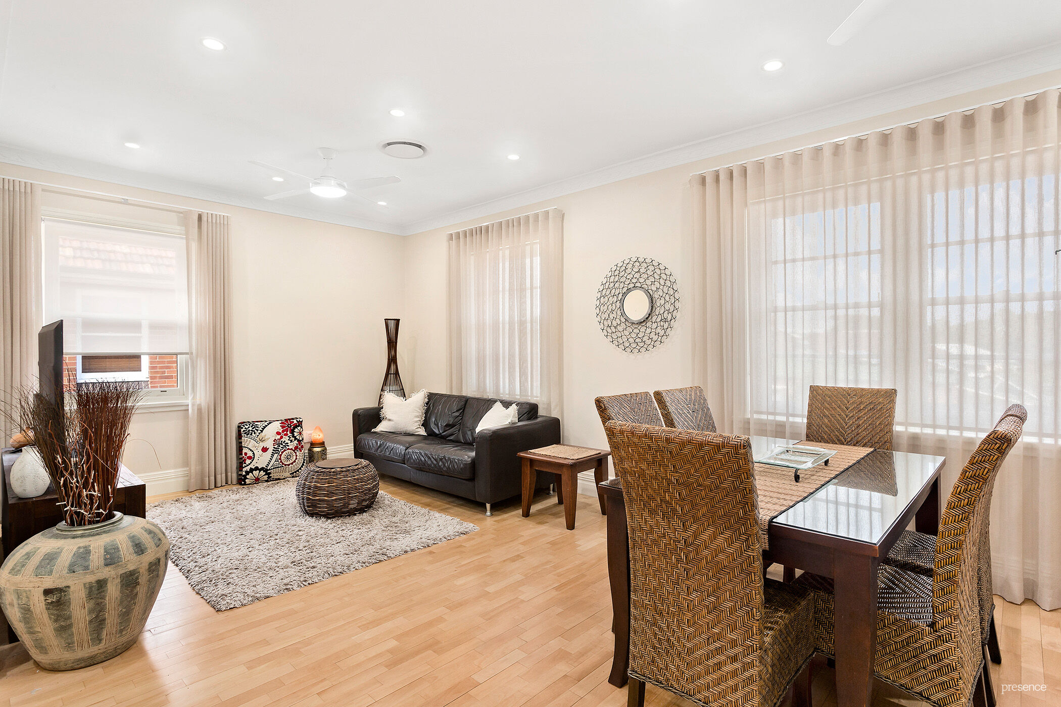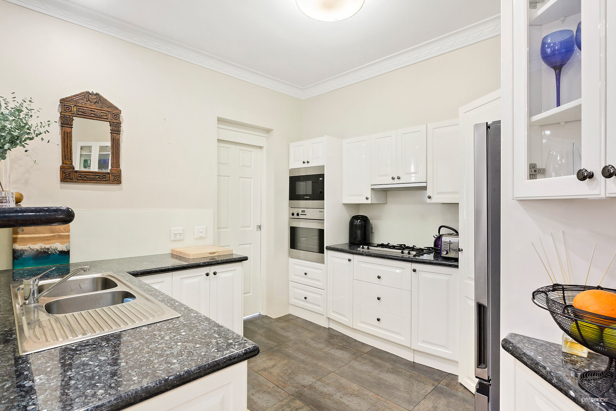 With classic lines, ornate cornices, beige carpets and multistep skirting boards, this property is a timeless beauty. Sheer curtains and blinds dress the original double hung windows and a black and white kitchen with a suite of high end stainless appliances opens onto the open plan living and dining space, with its soaring ceilings and gorgeous timber floors.