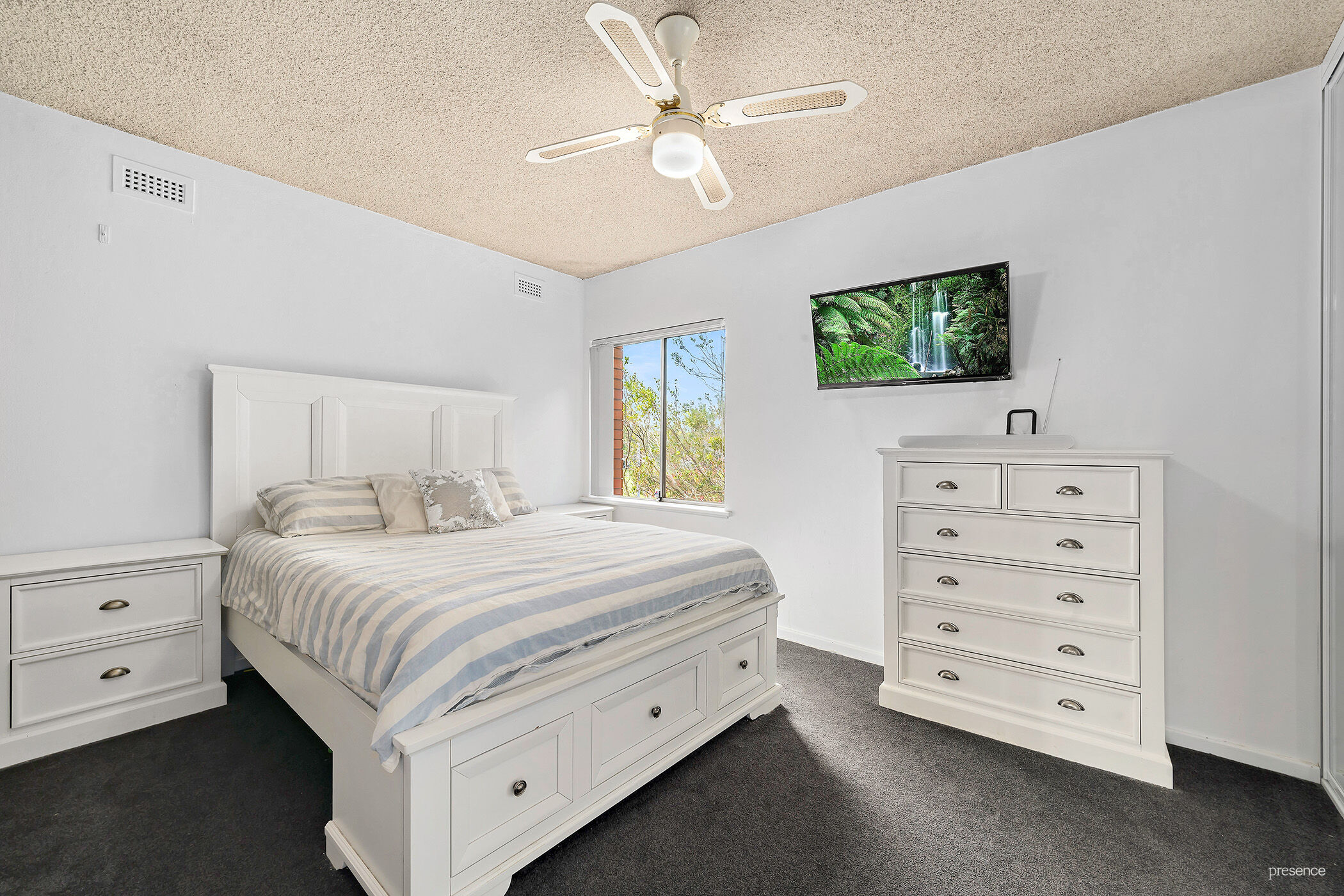 – Two good-sized bedrooms, master with mirrored built-in robe and ceiling fan.
