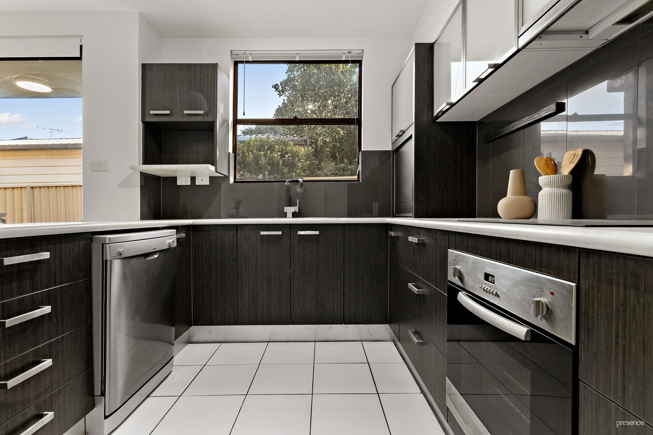 Modern kitchen with ceramic hob, under bench oven, dishwasher, plenty of storage
