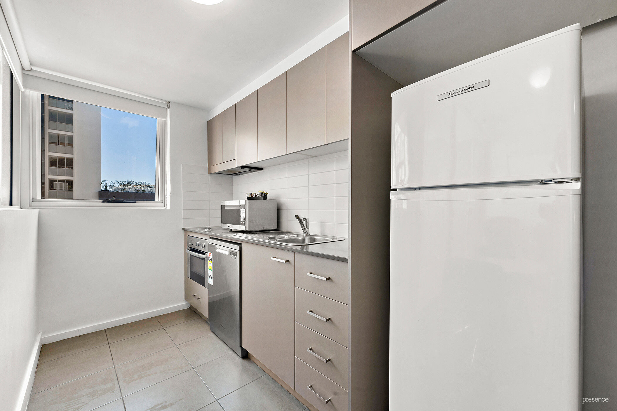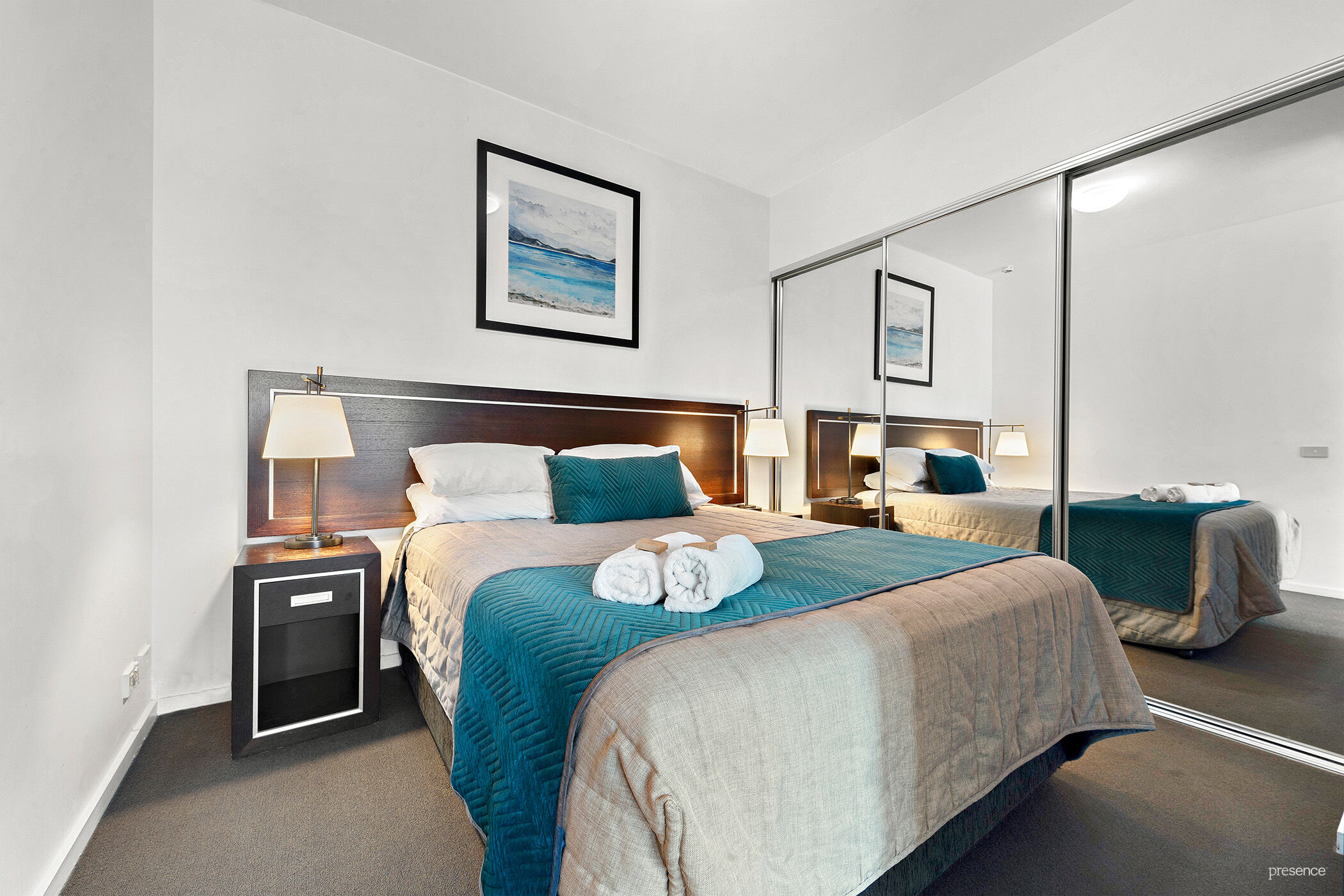 With quality furniture and an easy living floorplan, you’ll find plenty of space to relax indoors or enjoy the morning sun from your balcony. A well-lit corner kitchen offers stainless steel appliances and ample cupboard space to hold provisions for short or longer stays. Sliding mirrored doors to the bedroom provide privacy when required and conveniently open out to the living area allowing the sunshine to flow through.