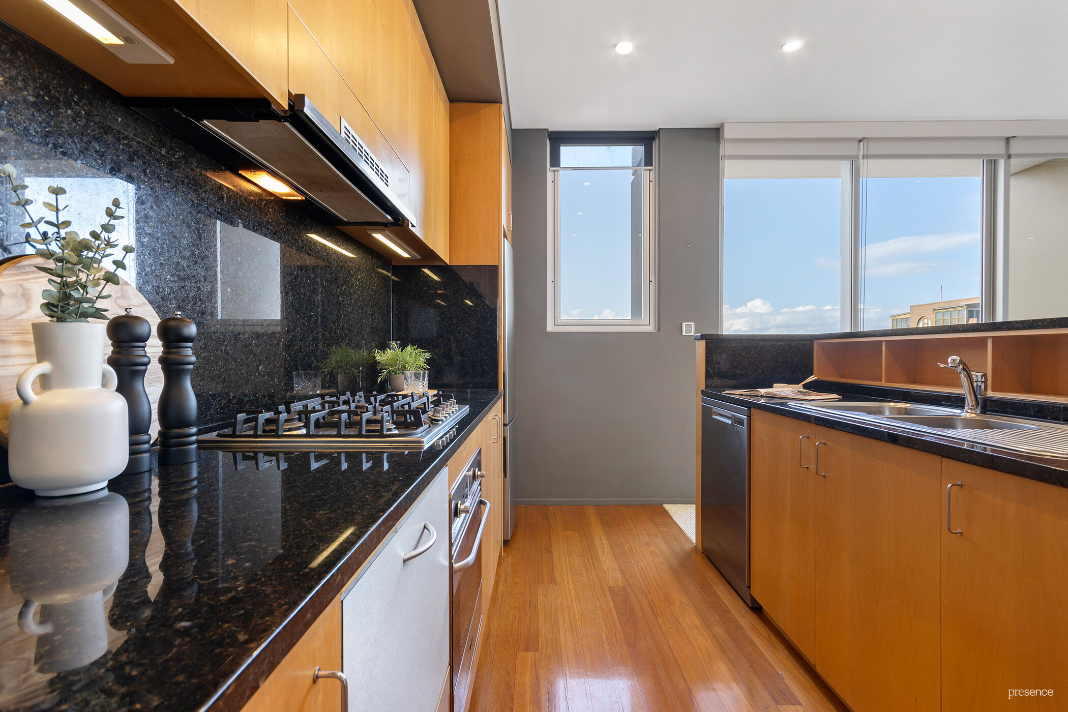 Kitchen with granite benches, Ilve gas cooktop & oven, Fisher & Paykel dishwasher
