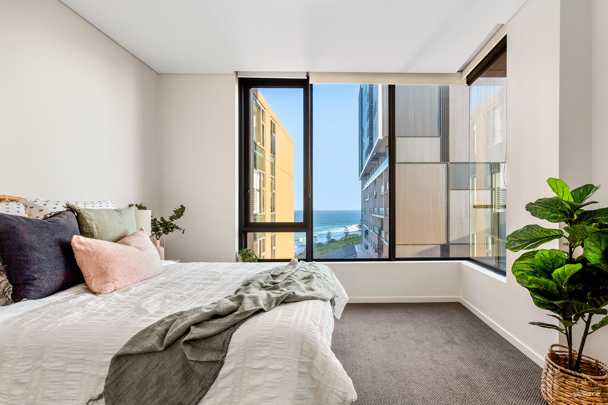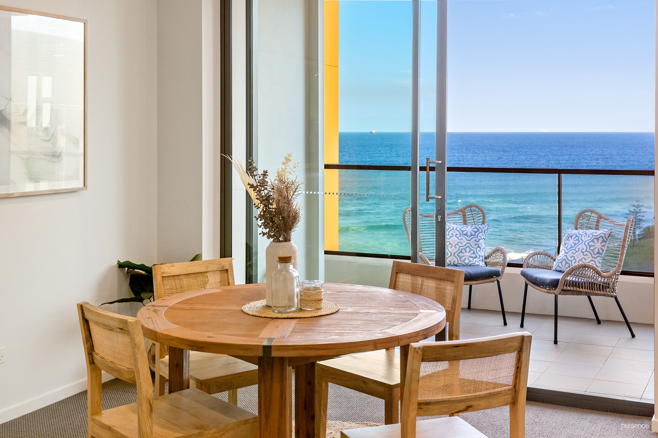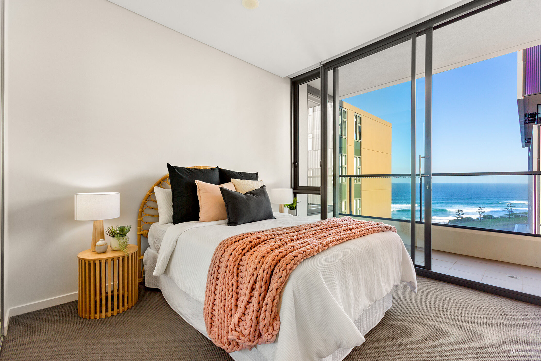 Step into a large, beautifully lit open-plan living area where the ever-changing seascape immediately captivates. The kitchen, featuring ample storage and a Caesarstone-topped island bench, seamlessly serves the dining area. The expansive alfresco terrace, accessible from both the living space and second bedroom serves as a perfect setting for outdoor dining or unwinding after a swim or surf session. The world-class living experience doesn’t end in your own apartment, as the resort amenities of a spa pool, gym and sauna await your pleasure.