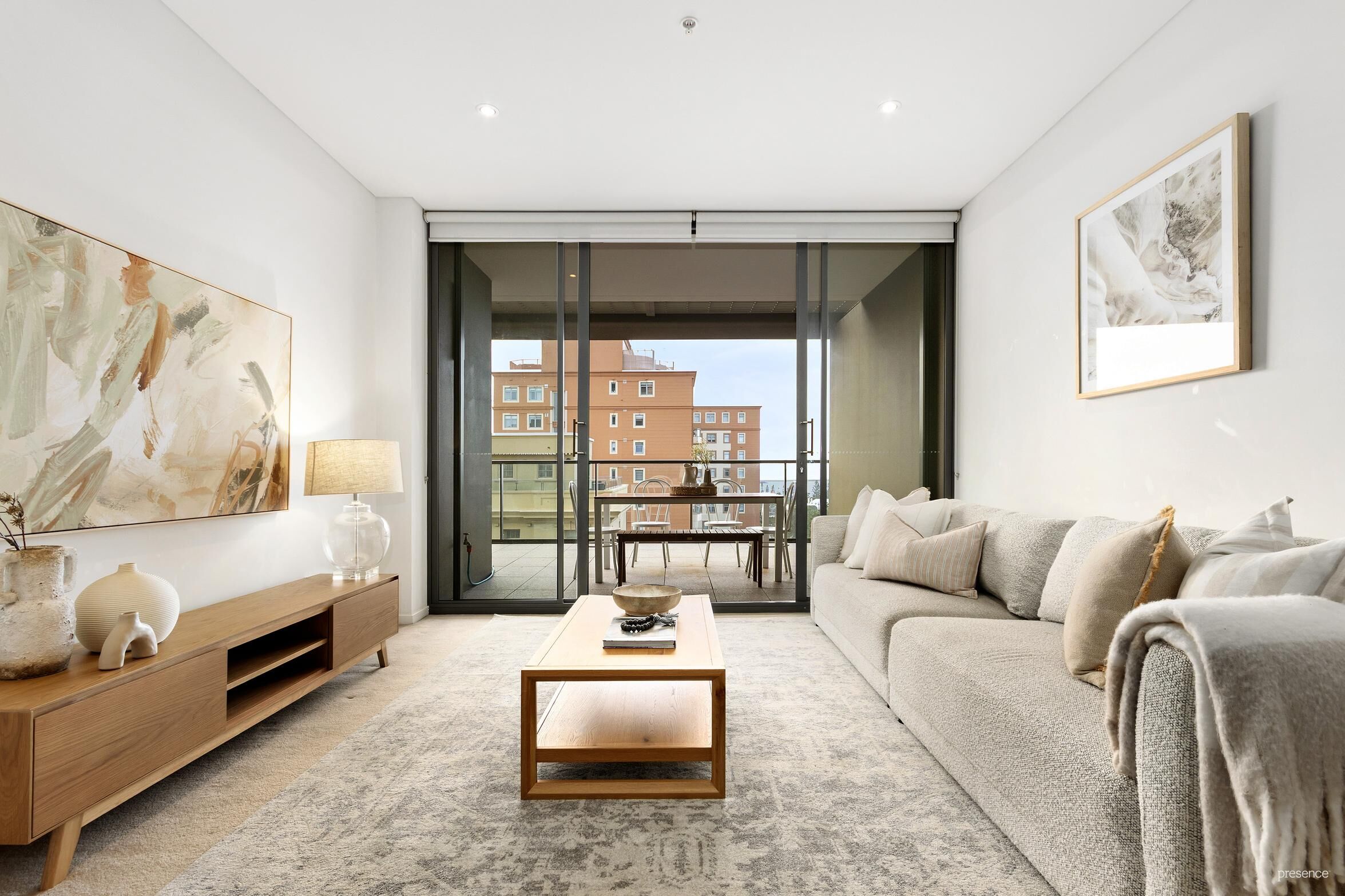 Open plan living connects to large balcony backdropped by park & Nobbys views