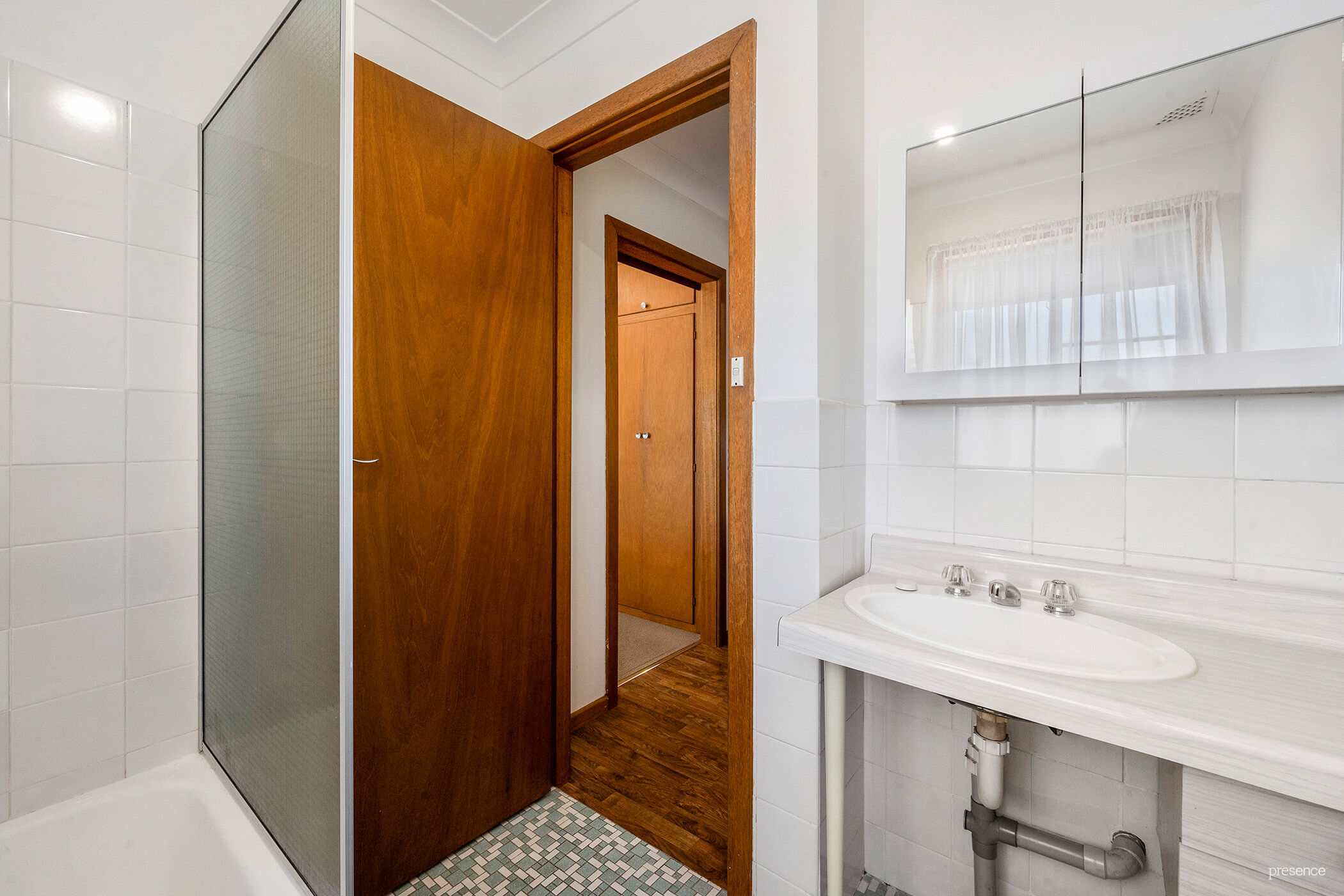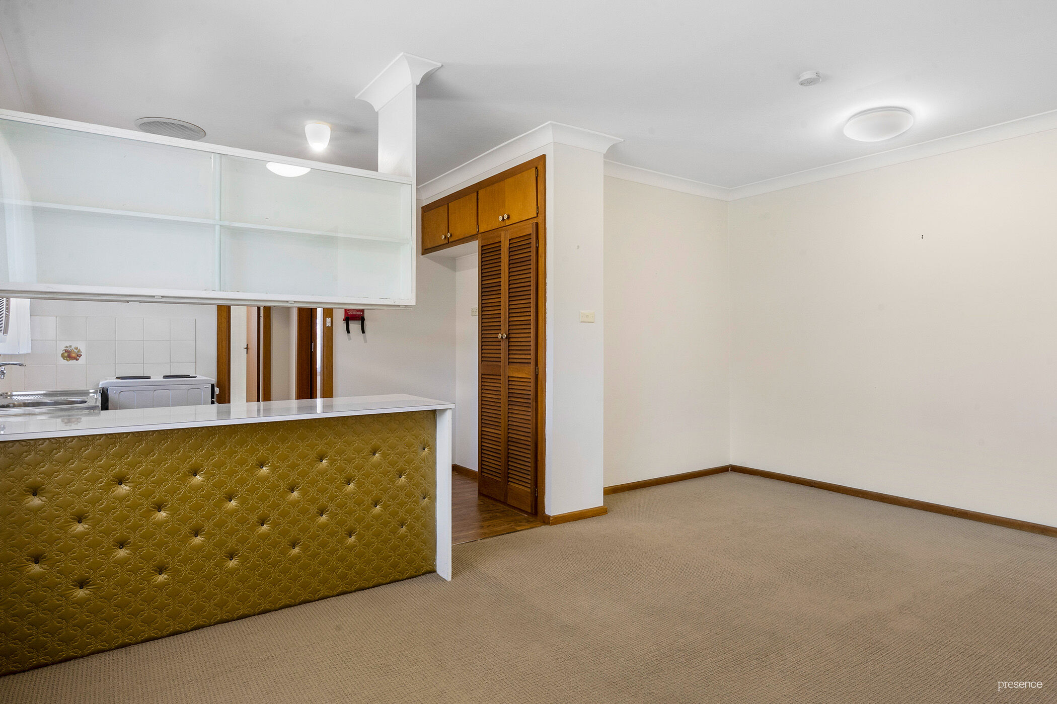 Featuring one large double bedroom with masses of storage space in the built-in robes, and bathroom with retro sink, shower over shub and mint condition vintage tiles. The kitchen is in very good order, but it’s the kitchen bench that’s the stand-out feature in this unspoiled original apartment. In immaculate condition, the bronze mid-century button-backed vinyl backing on the bench is the most amazing thing to behold. First-home owners who love that vintage style will want to retain this unique feature and perhaps jazz up the flooring and remove the bulkhead cupboards to give it the attention it deserves.
