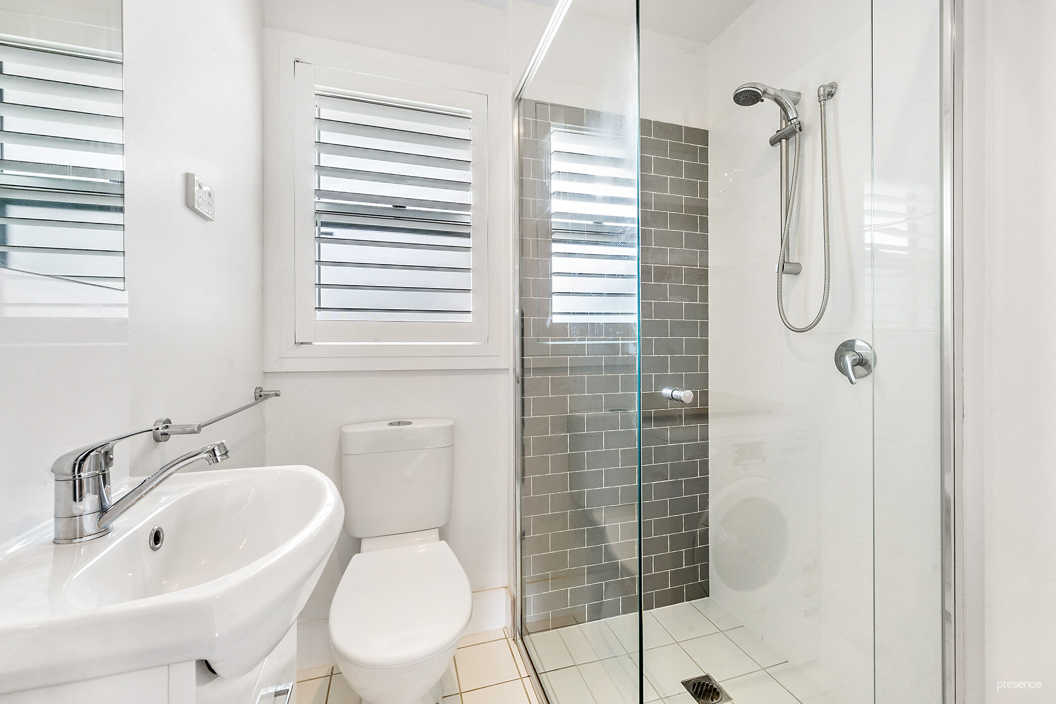 – Chic bathroom with large shower and wall-hung vanity; internal laundry