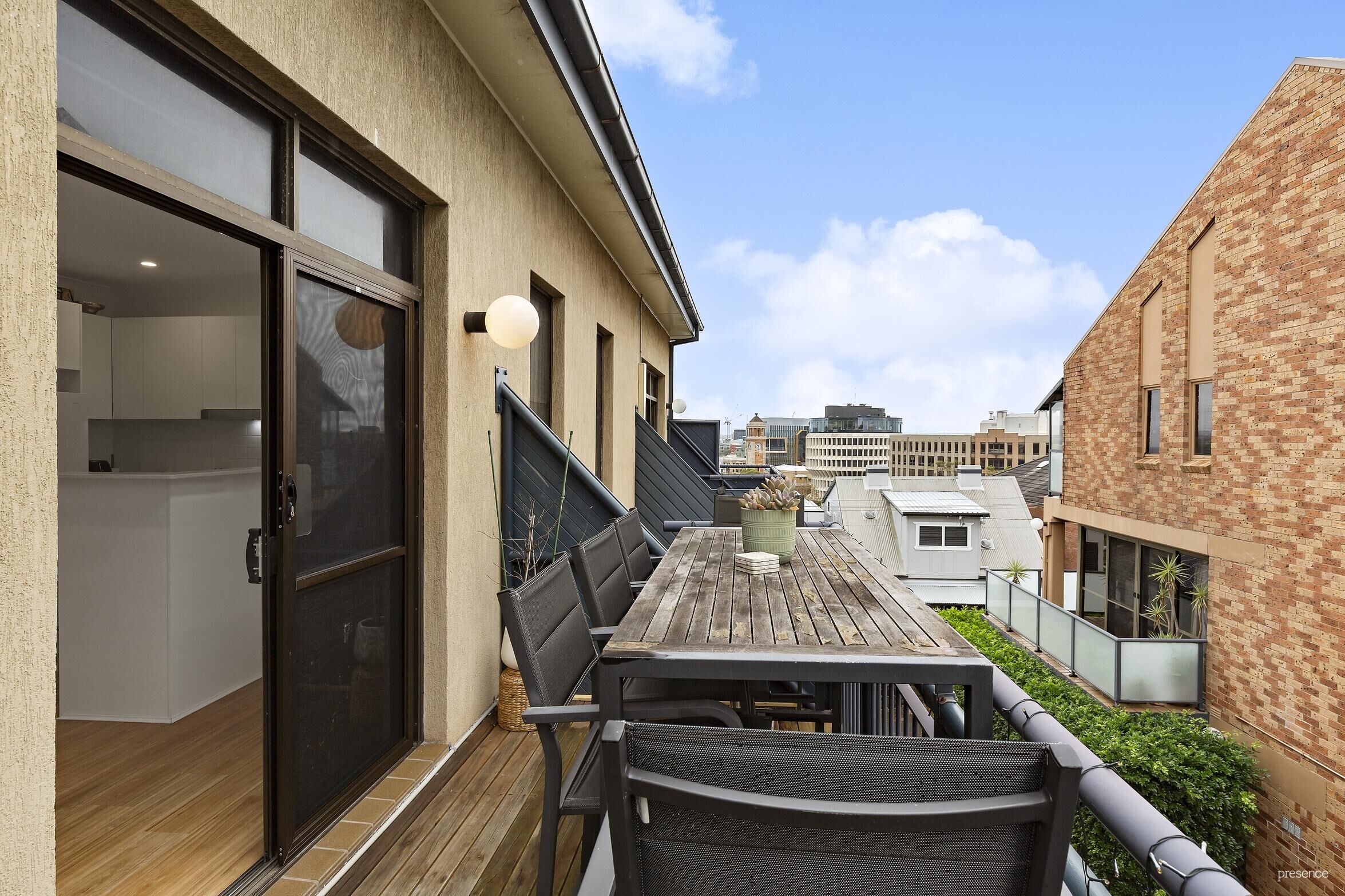 The spacious bedroom offers a peaceful sanctuary with a sizeable built-in robe and a second balcony, ideal for unwinding with a nightcap while soaking up the vibrant hum of the city. It enjoys stunning vistas of leafy Civic Park, the spire of the historic Newcastle Presbyterian church, and the newly refurbished clocktower of Newcastle City Hall. Adjacent, a sleek contemporary bathroom features a large vanity unit and walk-in shower. Even laundry days are made easier with a smart euro laundry that accommodates both a washer and dryer without sacrificing space.