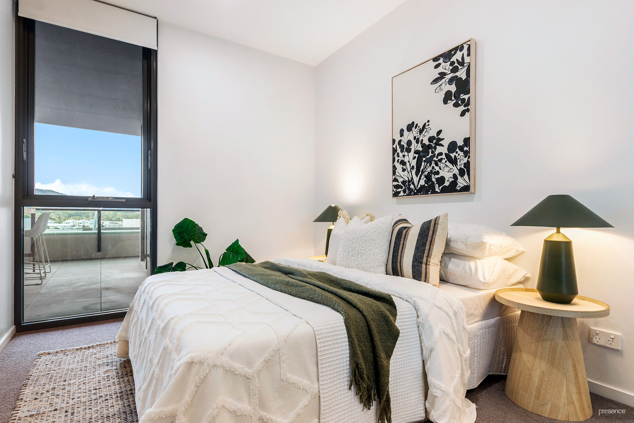 Both bedrooms share the apartment’s sunny aspect, with large windows framing views of the surrounding hills. Each features built-in wardrobes and abundant storage. The master retreat enjoys private access to the balcony and a streamlined ensuite echoing the elegance of the main bathroom with floor-to-ceiling tiles, floating vanities, and a walk-in shower. Adding to the comfort and ease of the home, zoned ducted air-conditioning provides year-round climate control throughout.