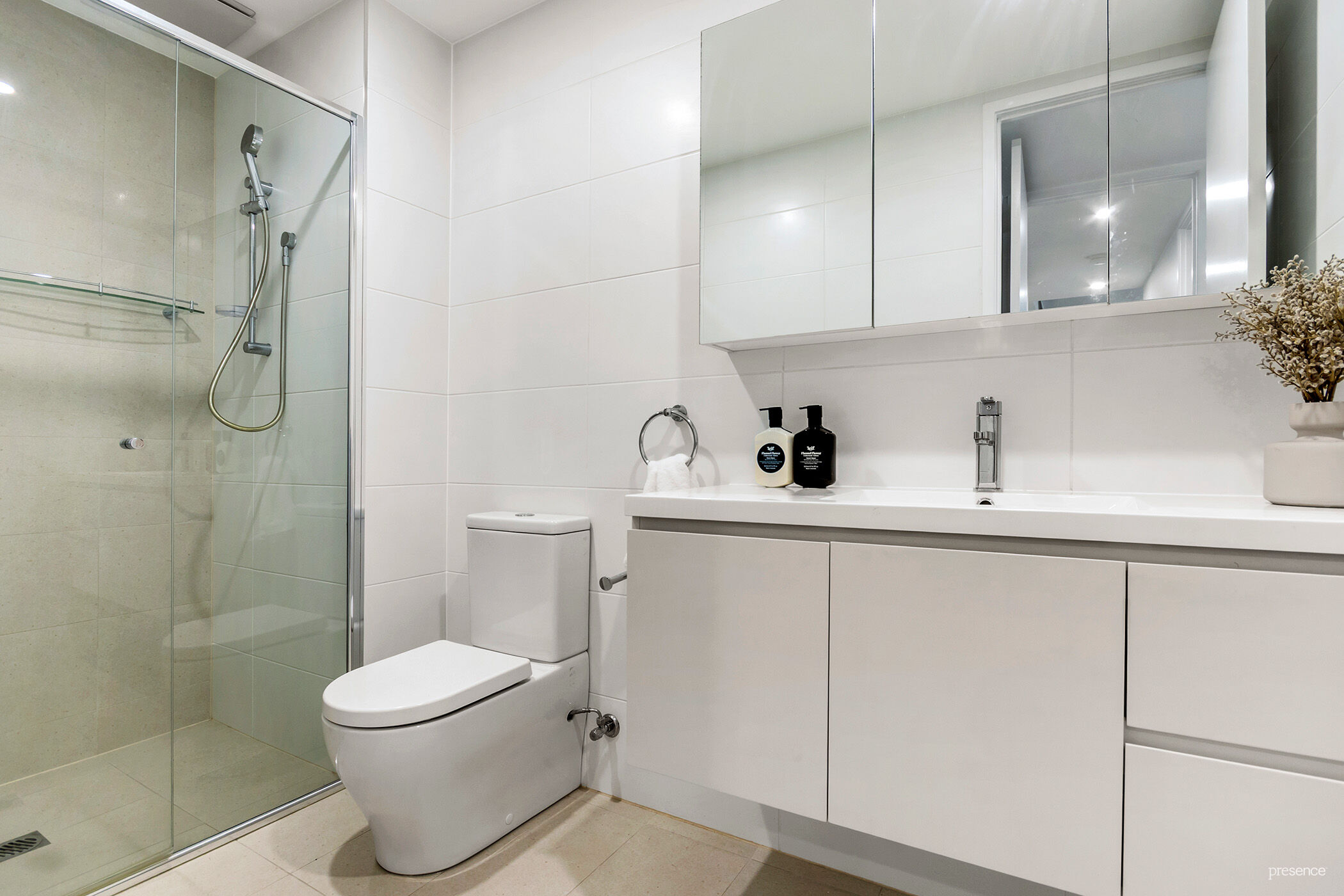 – Two elegant bathrooms, including an ensuite to master, each with floor-to-ceiling tiles, walk-in showers, floating vanities, and mirror cabinets for extra storage.