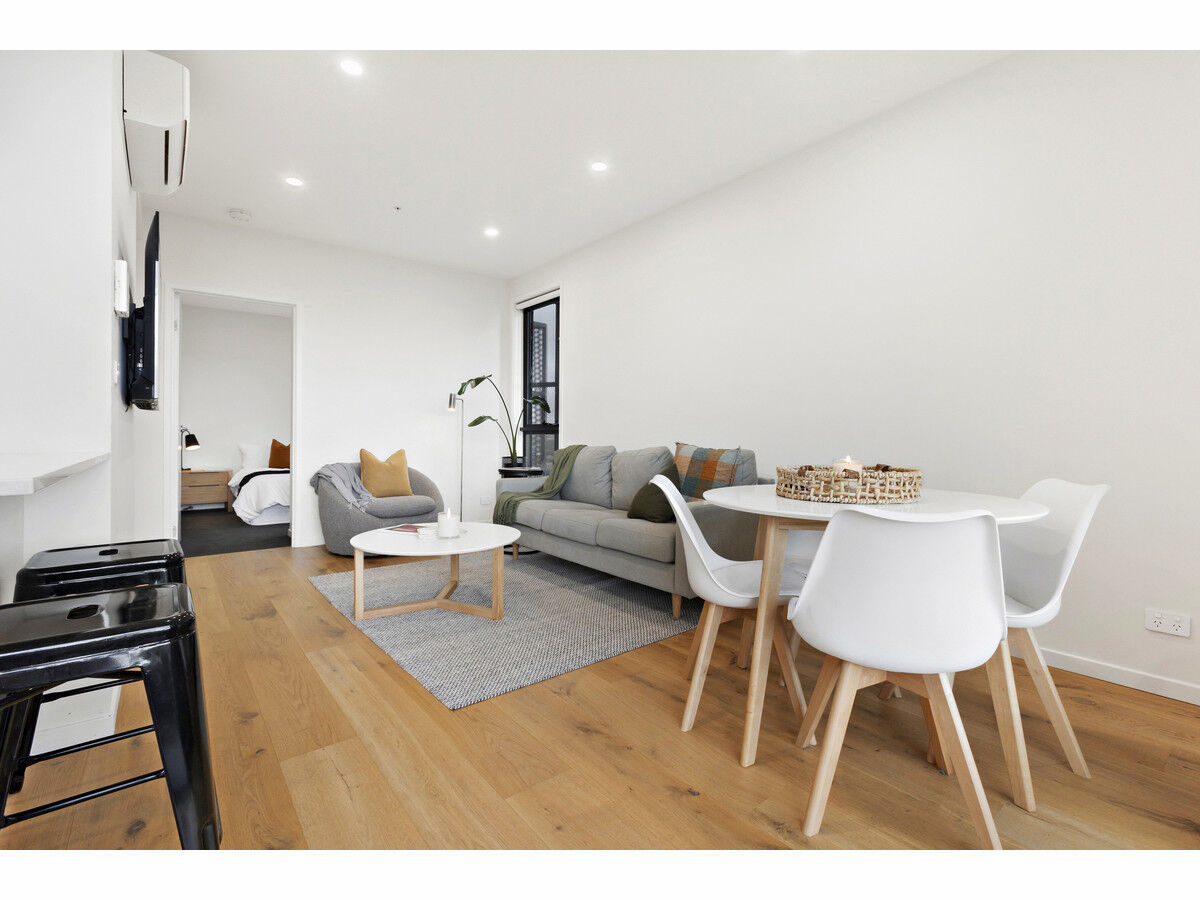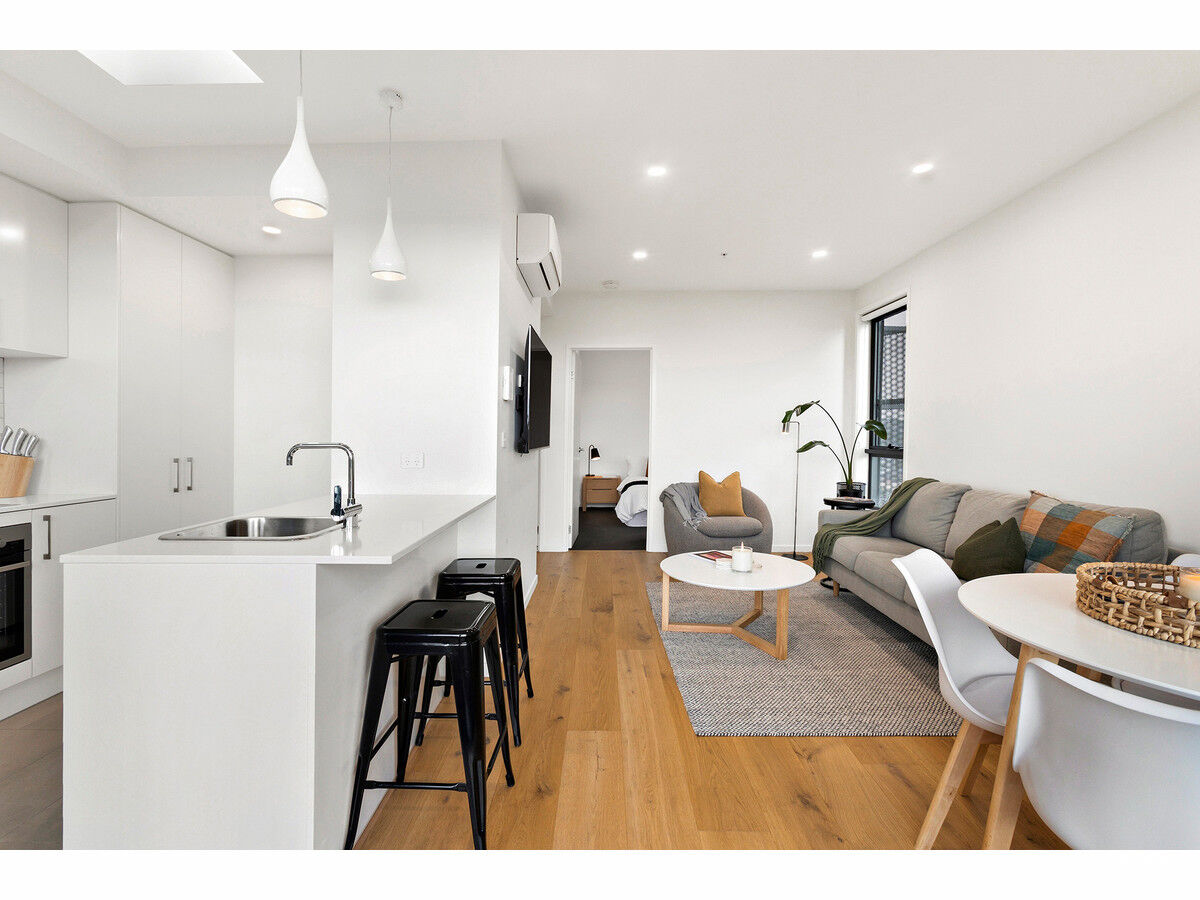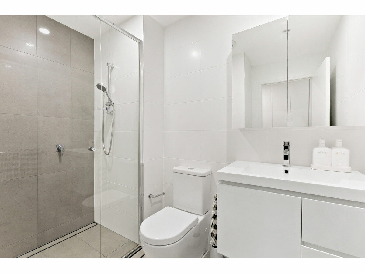 Inside, the apartment features floating floorboards throughout the living area and plush carpet in the bedroom for added comfort. The light-filled kitchenette is well-appointed with electric cooking, a dishwasher, and generous cupboard space. The sleek bathroom is fully tiled and features a frameless glass shower screen and floating cabinetry, reflecting the apartment’s modern aesthetic.