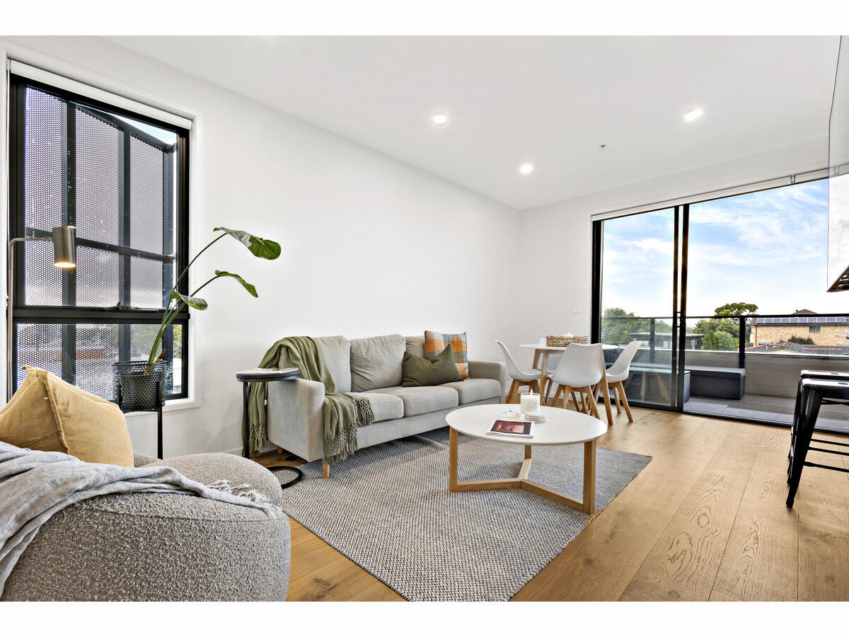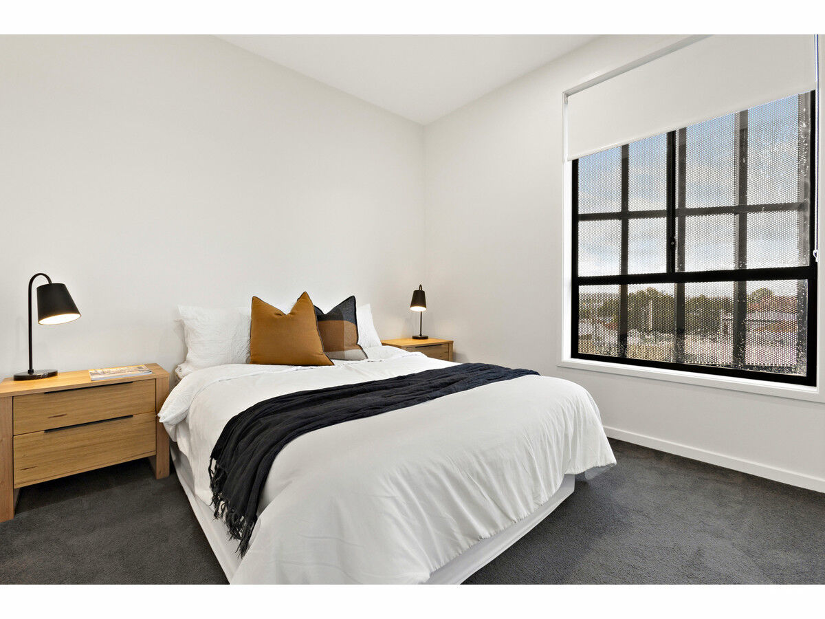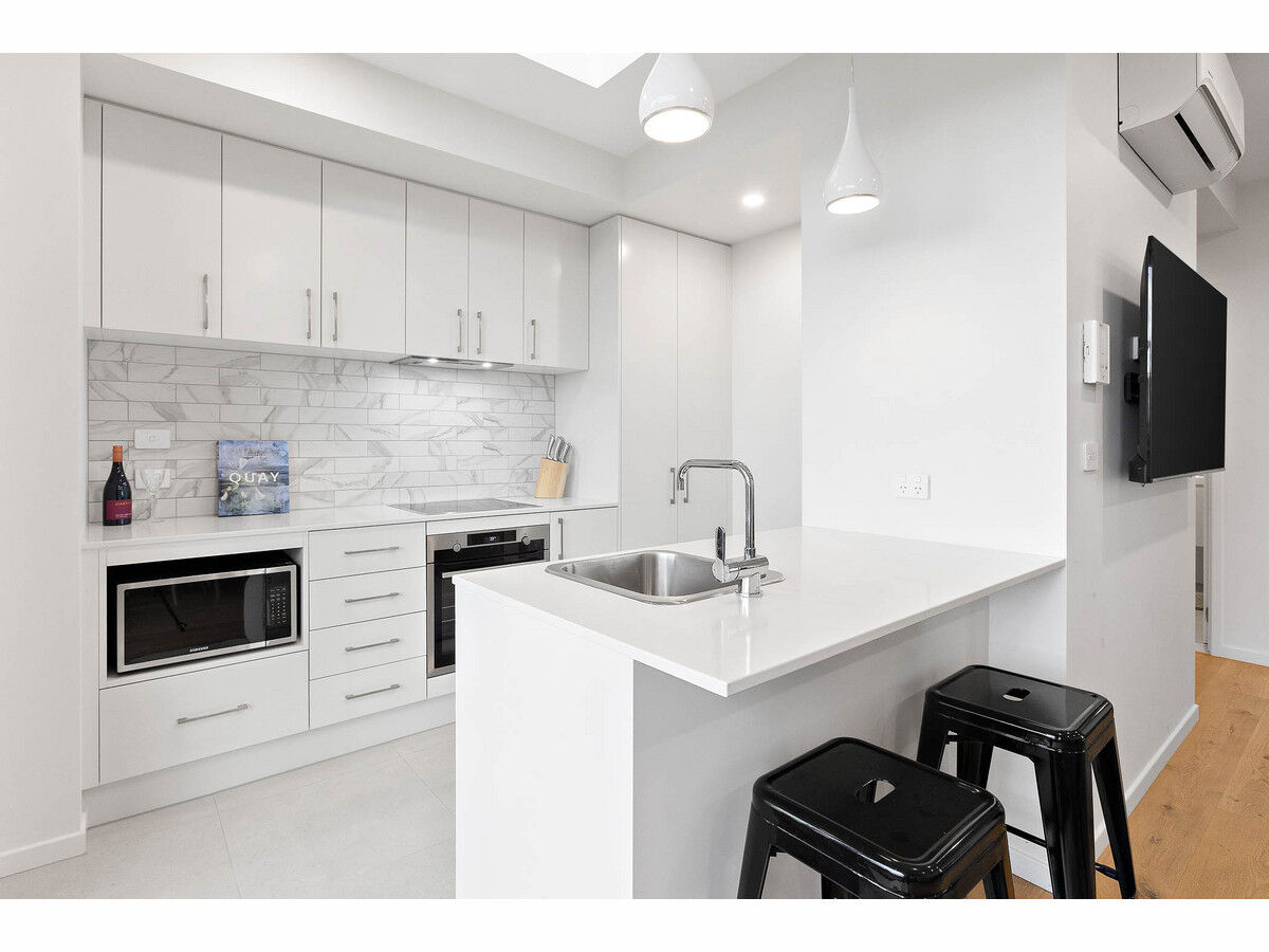 Inside, the apartment features floating floorboards throughout the living area and plush carpet in the bedroom for added comfort. The light-filled kitchenette is well-appointed with electric cooking, a dishwasher, and generous cupboard space. The sleek bathroom is fully tiled and features a frameless glass shower screen and floating cabinetry, reflecting the apartment’s modern aesthetic.