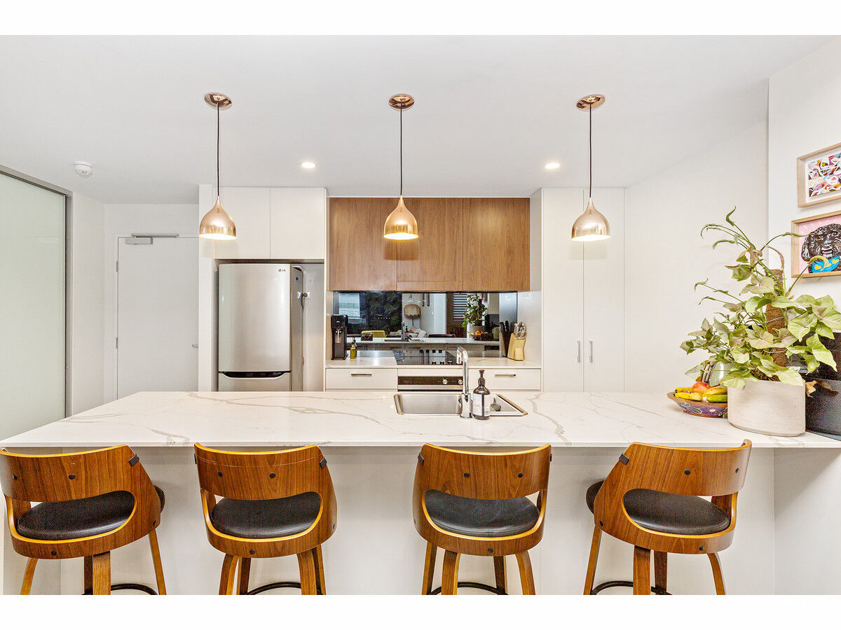 – Kitchen with Caesar stone bench tops, electric cooktop and dishwasher