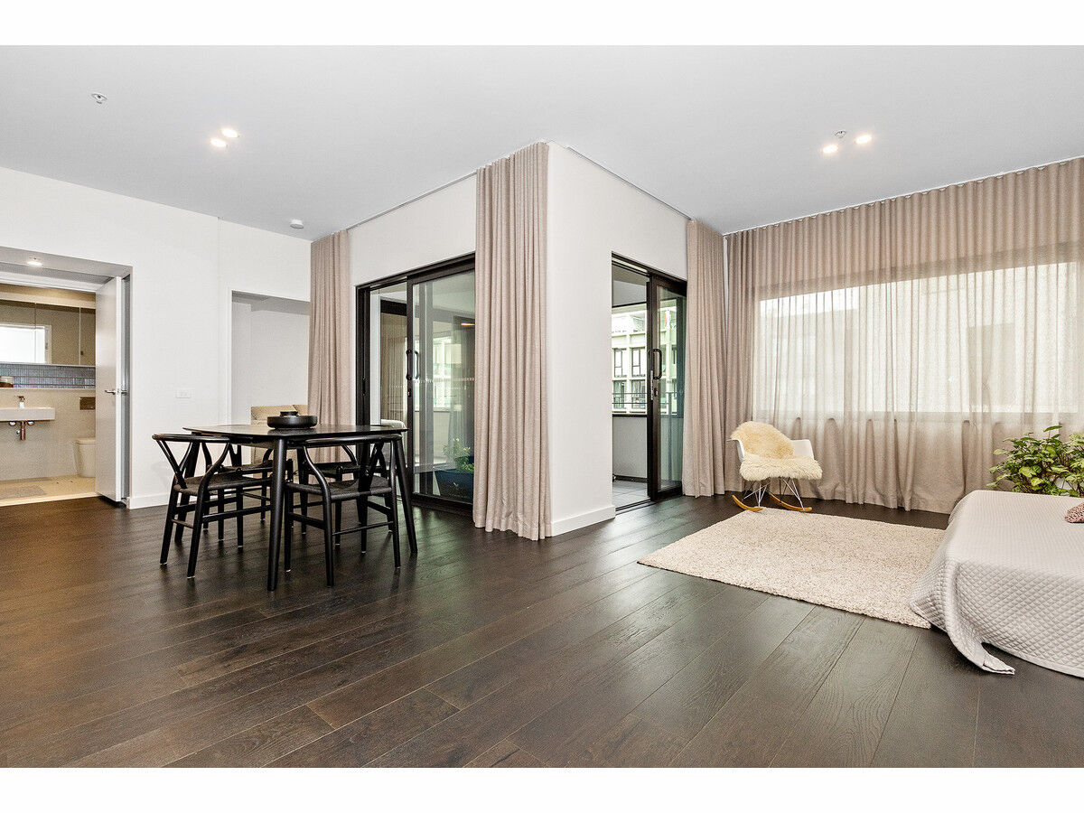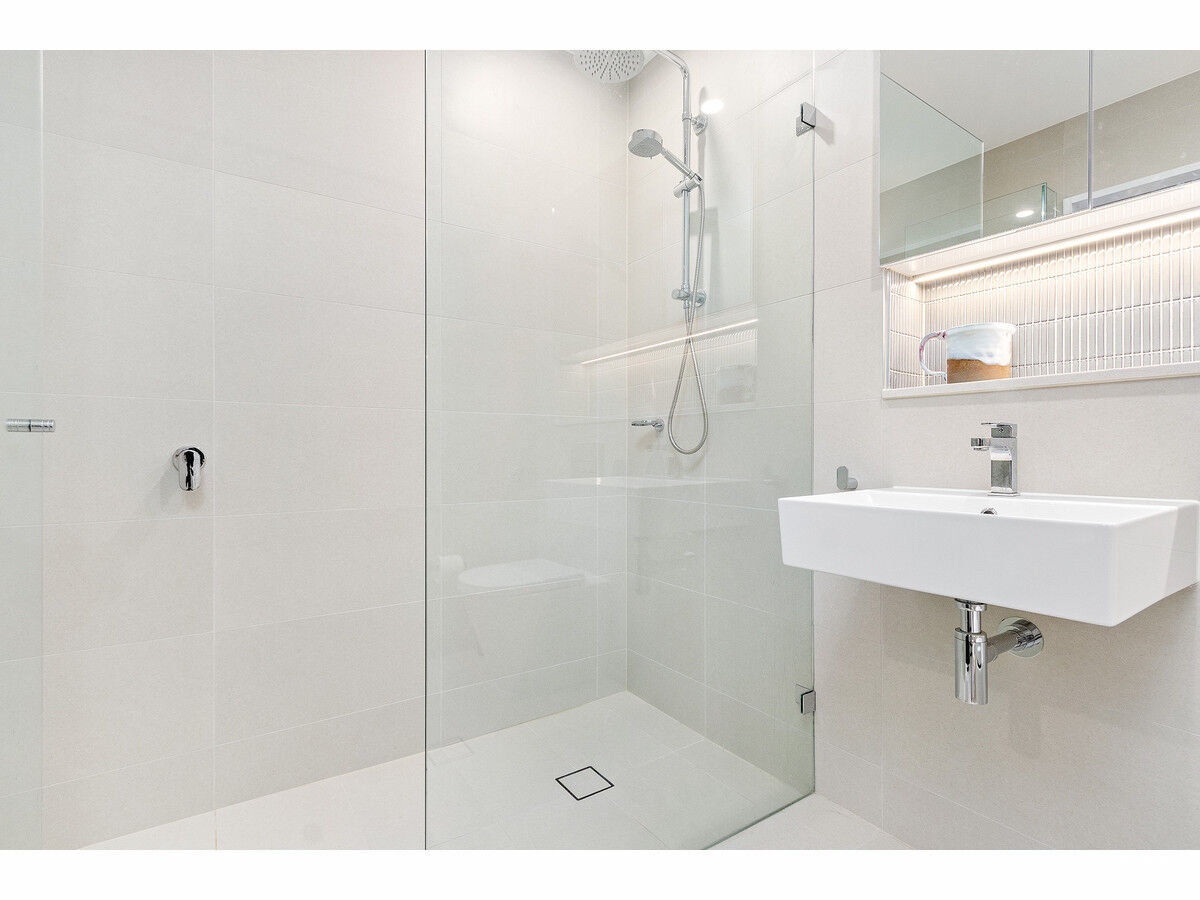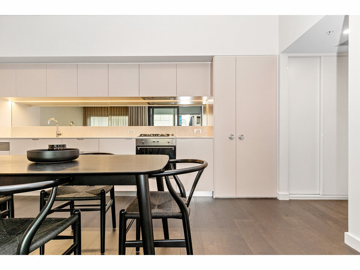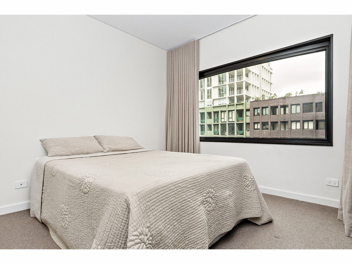 The open plan living space is generous and offers sliding glass door access to a covered balcony with views of the retail piazza, showcasing its light and water installations. A stylish neutral colour palette accentuates the space, and a well-appointed kitchen features built in fridge/freezer and an integrated dishwasher. One good sized bedrooms with built in robe and a stylish bathroom as well as a good-sized laundry make this apartment ultimately liveable.