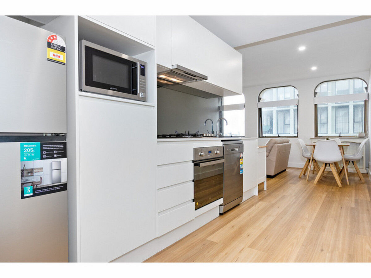 Facing north and offering a wall of windows, that allows sunshine and light to stream in and make this apartment bright and cheerful. A big airy bathroom with loads of storage doubles as an ensuite, with dual access points, one of which opens directly into the bedroom, which then, in turn, opens up to the living area. The contemporary and sleek, very on-trend, one-wall kitchen offers a gas cooktop, under-bench oven and dishwasher. A European-style laundry, with dryer included, is tucked discreetly into the bathroom completing all your living requirements, wrapped in a neutral palette fit-out, that is designed to allow you to furnish these spaces in any style that you desire. And as if all this wasn’t already enough there is also the common rooftop area with a big alfresco lounge and dining area.