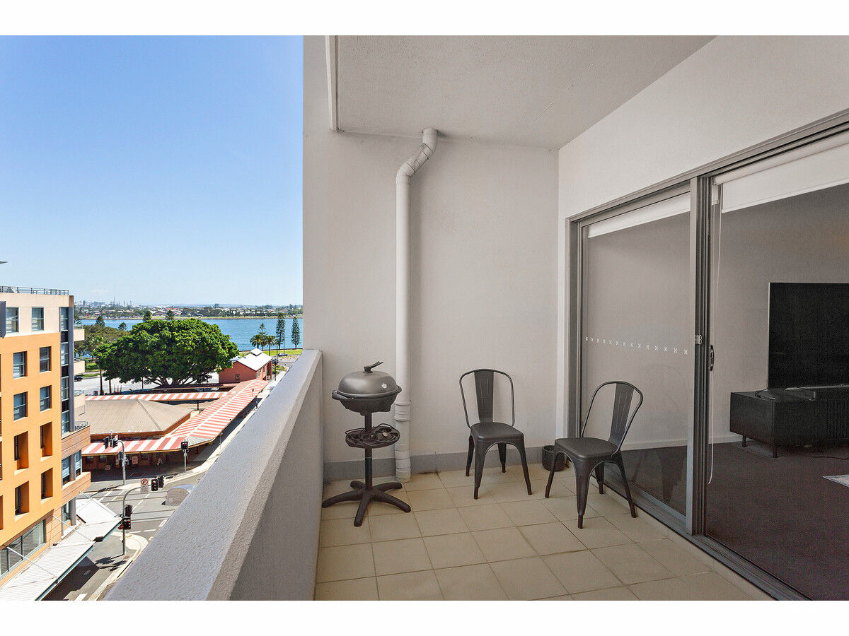 Step inside to discover a spacious, air-conditioned open-plan living area, ideal for entertaining guests or enjoying a peaceful evening at home. Slide open the glass doors to reveal a generous balcony, perfectly suited for a barbecue or outdoor lounge setting. Overlooking Watt Street with glimpses of the bustling harbour and the iconic Newcastle Station complex, this alfresco space offers a serene yet dynamic backdrop.