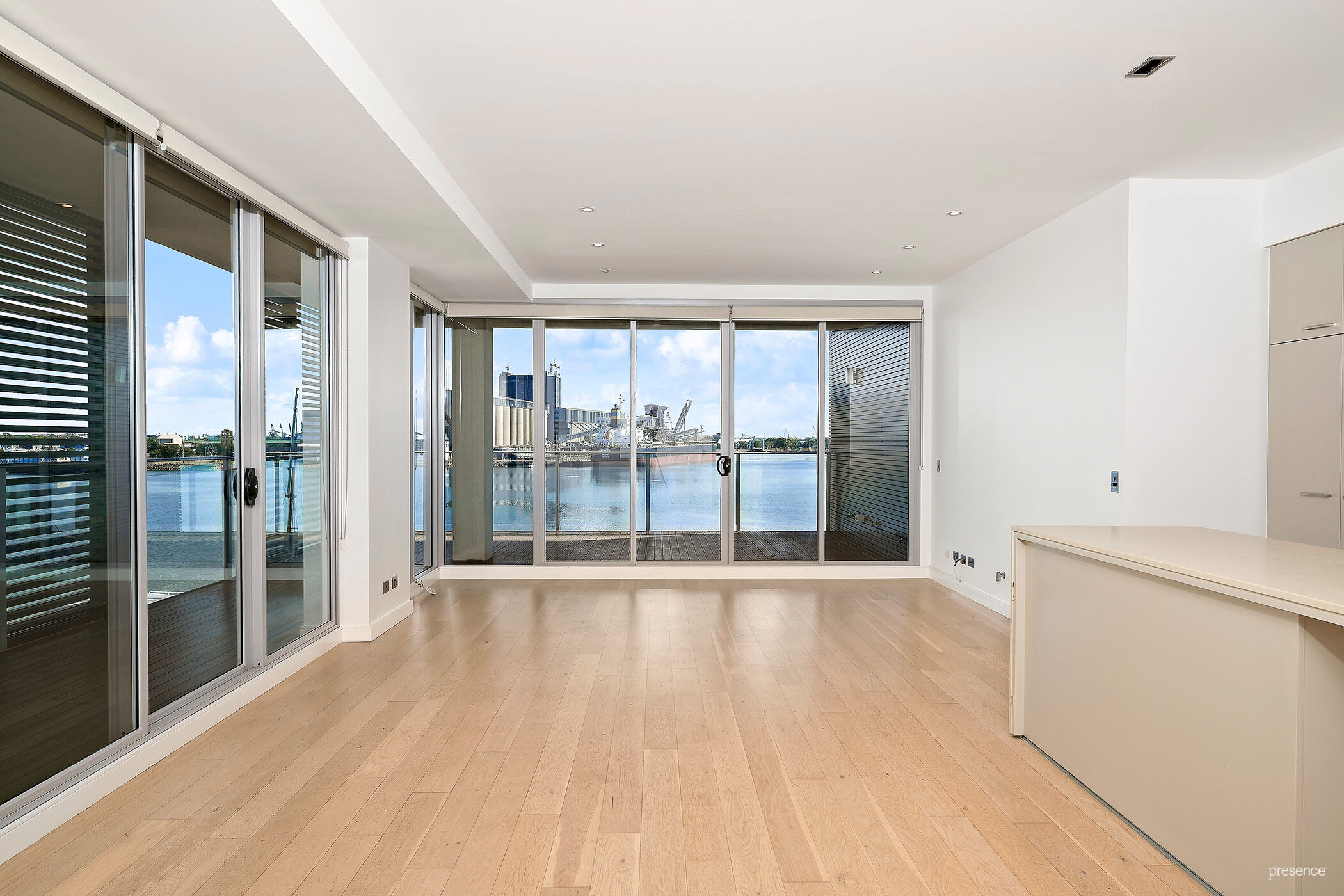 The thoughtfully designed layout provides generous open-plan living and dining, creating a seamless flow for both everyday living and entertaining, while large windows invite in natural light and capture the surrounding urban and coastal atmosphere.