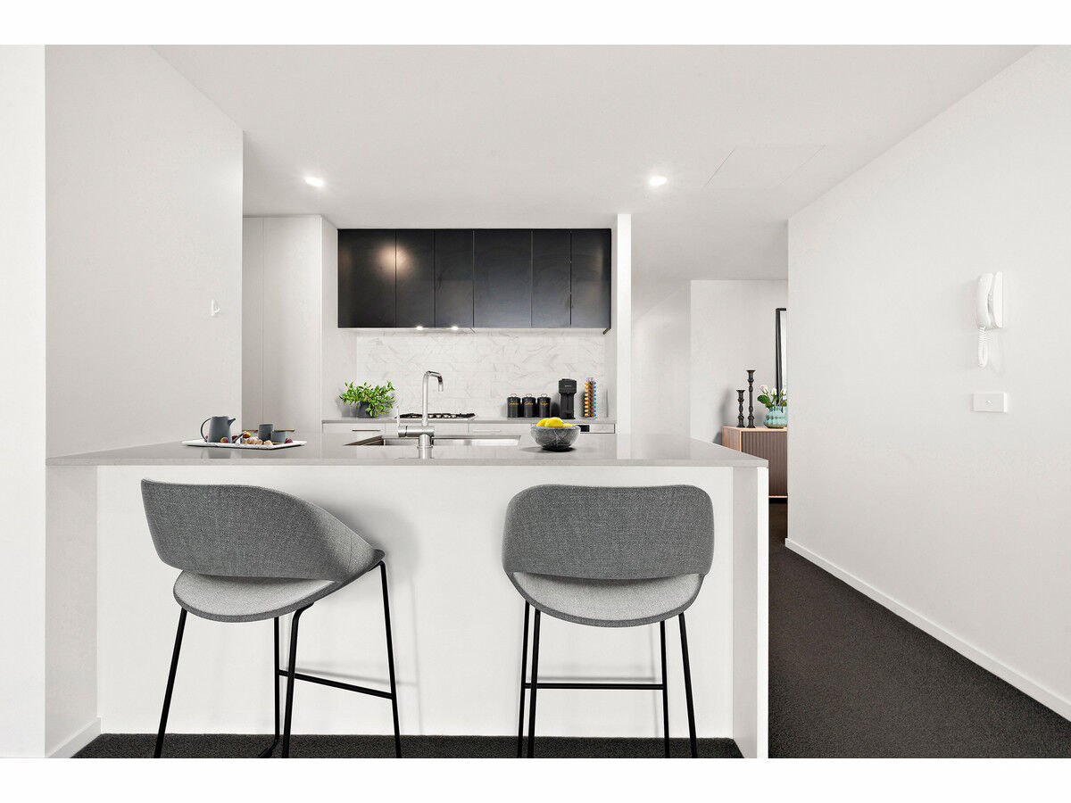 The modern kitchen features stone benchtops, dual ovens, and gas cooking—perfect for creating culinary masterpieces. Positioned centrally, it seamlessly connects to the open-plan living area, allowing you to interact with guests as they gather in the stylish living space or unwind on the expansive balcony.