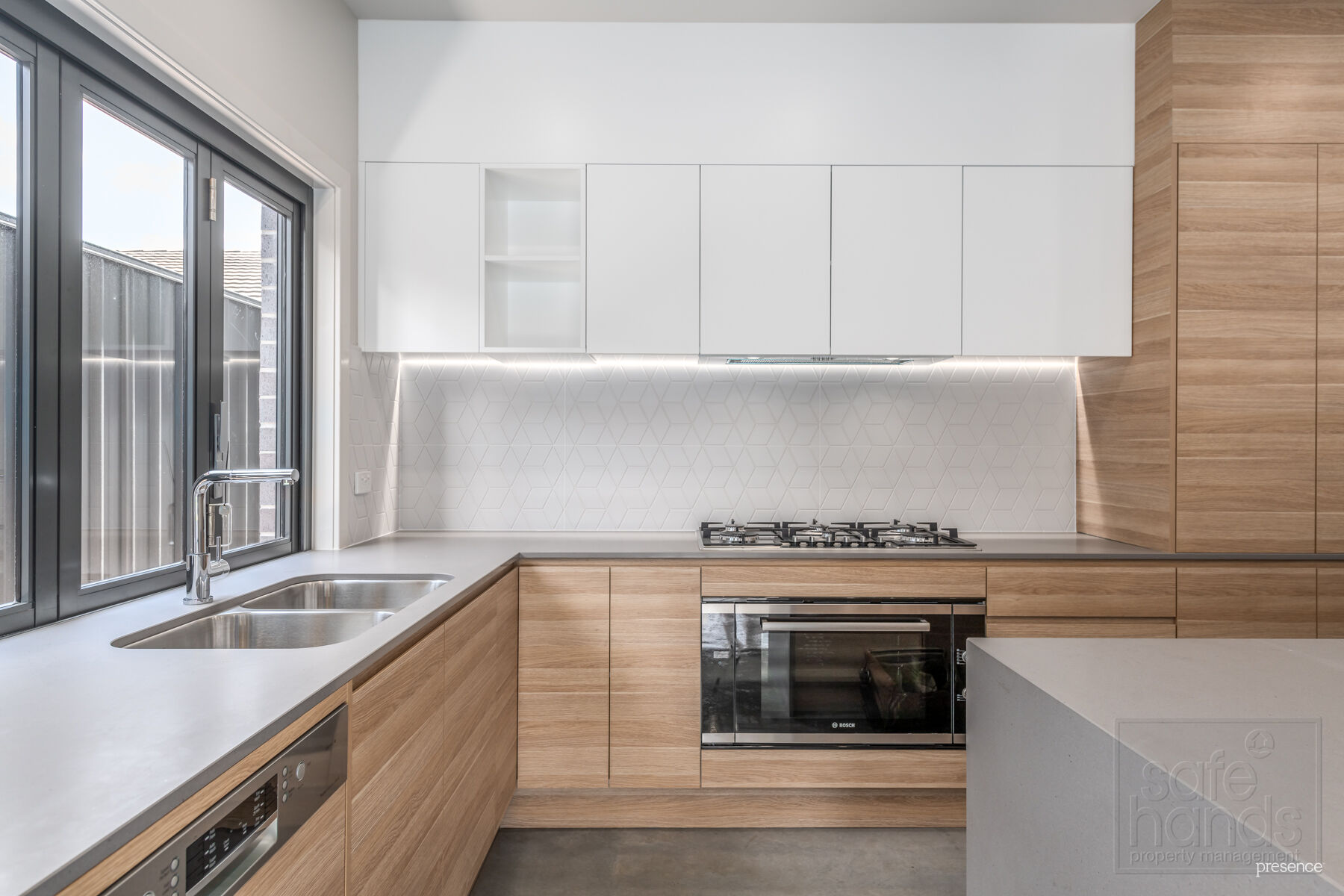 – Caesarstone benches with Polytec Ravine cupboard doors and drawers