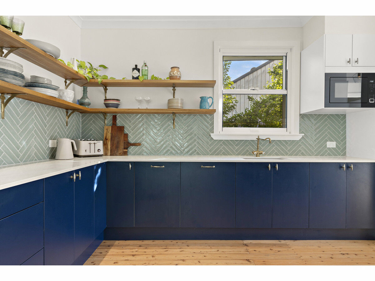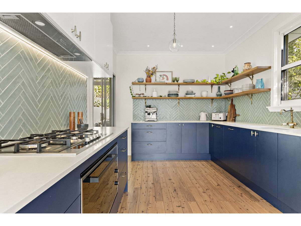 You are welcomed by an artfully landscaped front yard featuring a harmonious blend of flowering and tropical plants, complemented by natural hardscaping. Step inside this captivating home, where refinished timber floors exude warmth and character, sunlit by modern aluminium windows. An inviting air-conditioned lounge and dining, complete with a cozy study nook, seamlessly transitions to a stunning custom-built kitchen, installed just 18 months ago. This culinary haven boasts stone benchtops, stylish timber shelving, and integrated appliances, including a 900mm oven, 5-burner gas cooktop, convection microwave, and integrated dishwasher.