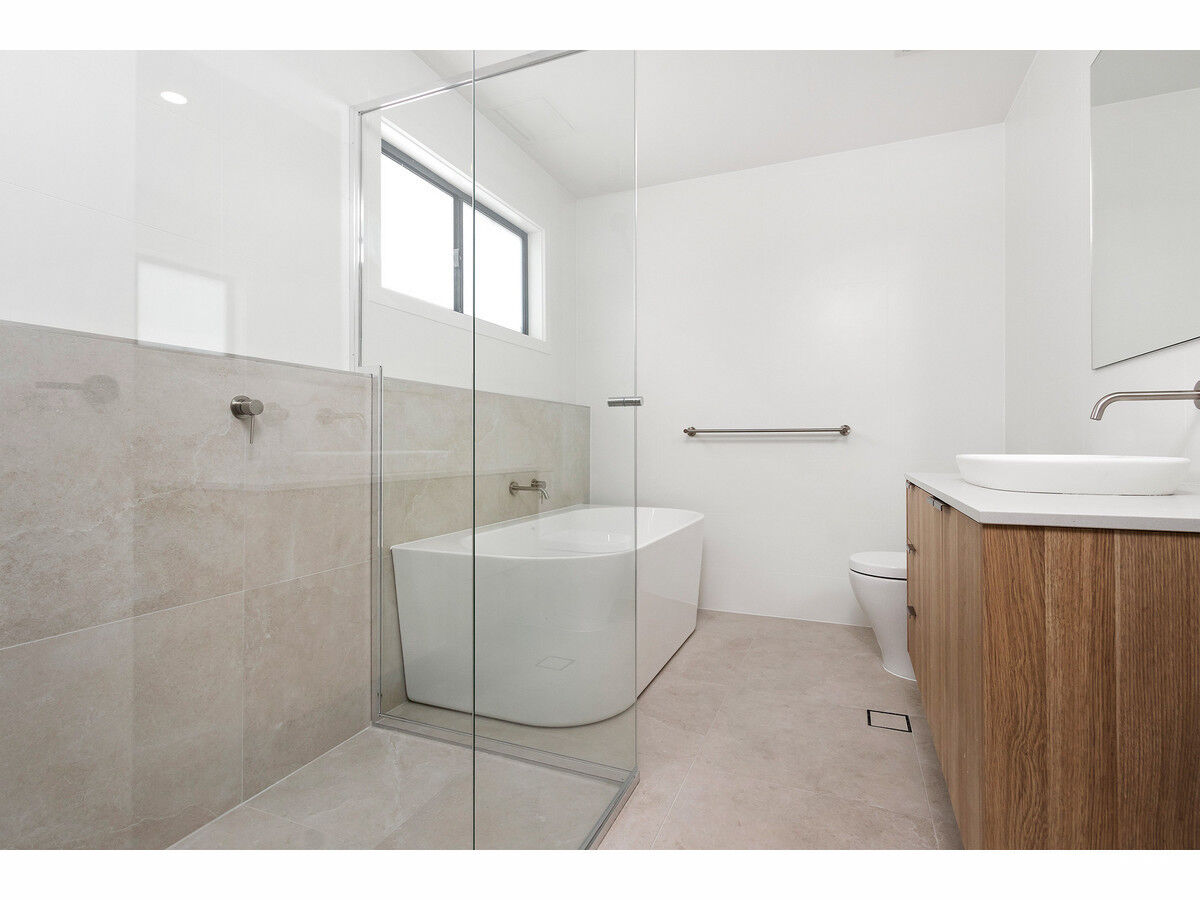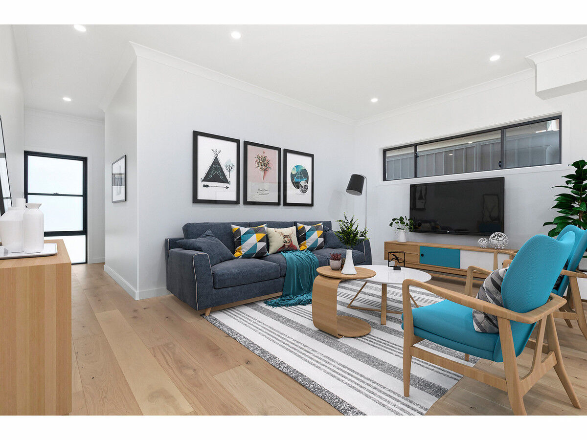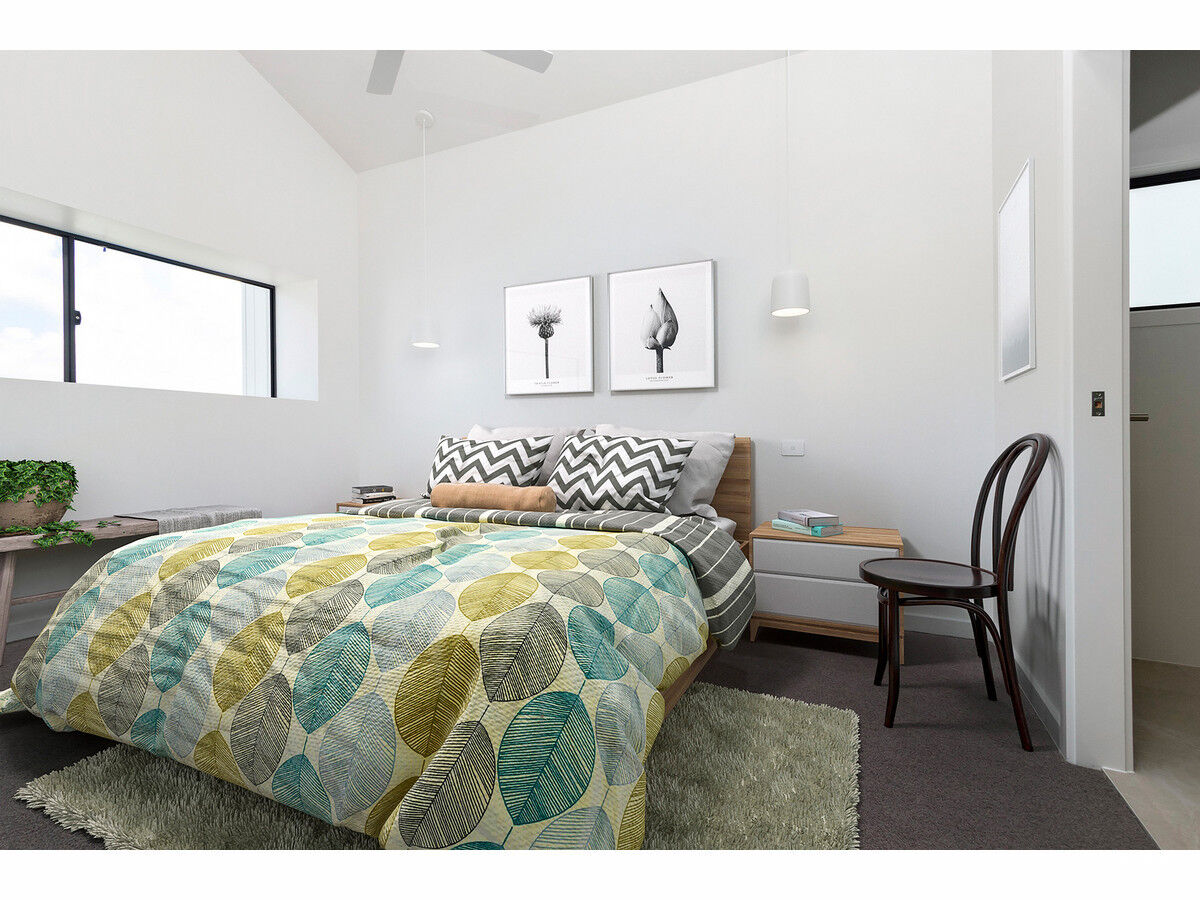 Upstairs is the vaulted third living space come private home office with ceiling fan and further storage. The master bedroom reigns supreme here, also with a vaulted ceiling, plus feature pendants, ceiling fan, walk-in robe and envious showered ensuite. Bedrooms two and three are also a great size and each are complete with built-in robes. They are serviced by the sleek and stylish full-size bathroom with a large soaker tub, separate shower, bespoke vanity, and w/c.