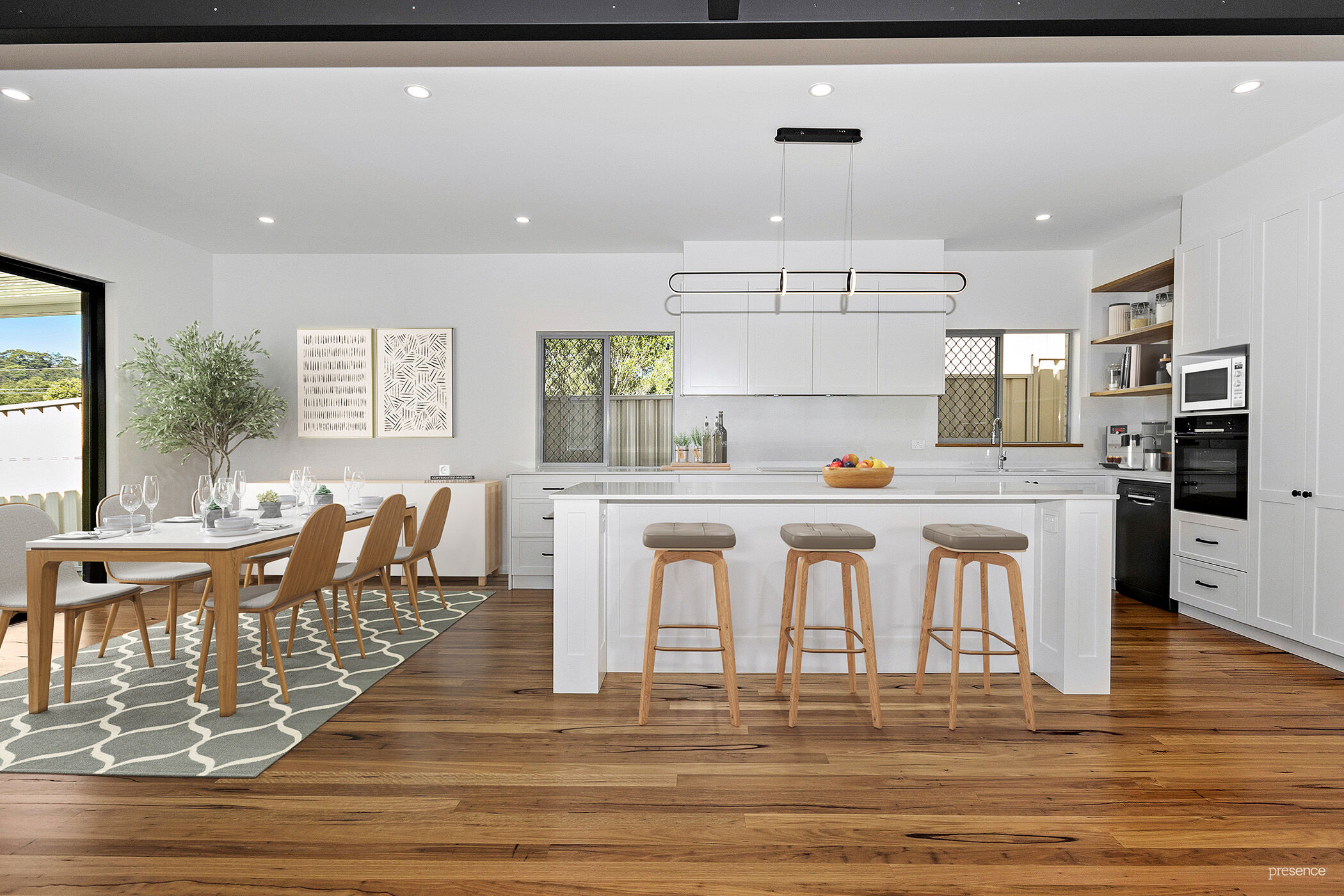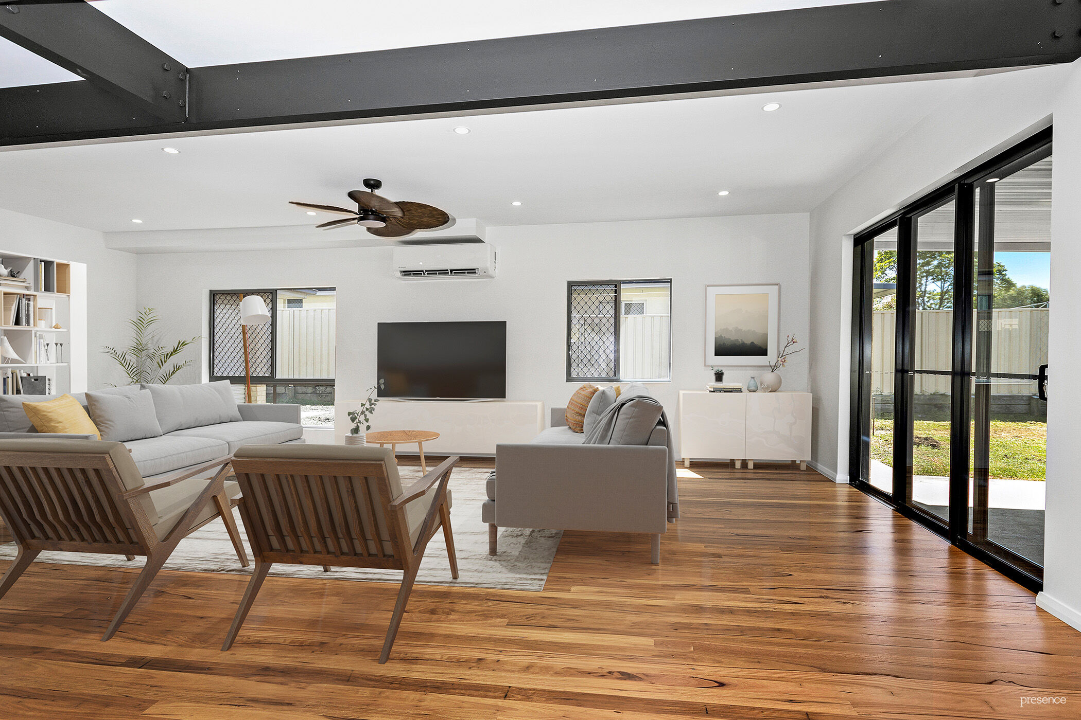 Step into this premium renovated residence and be captivated by the stunning expansive open-plan living and dining area adorned with exposed feature beams. The heart of the home boasts a sumptuous, gorgeous kitchen featuring an oversized island, vast storage, dishwasher, and high-end appliances. Blackbutt flooring flows seamlessly throughout, complemented by fresh paint, quality carpeting, and window treatments.