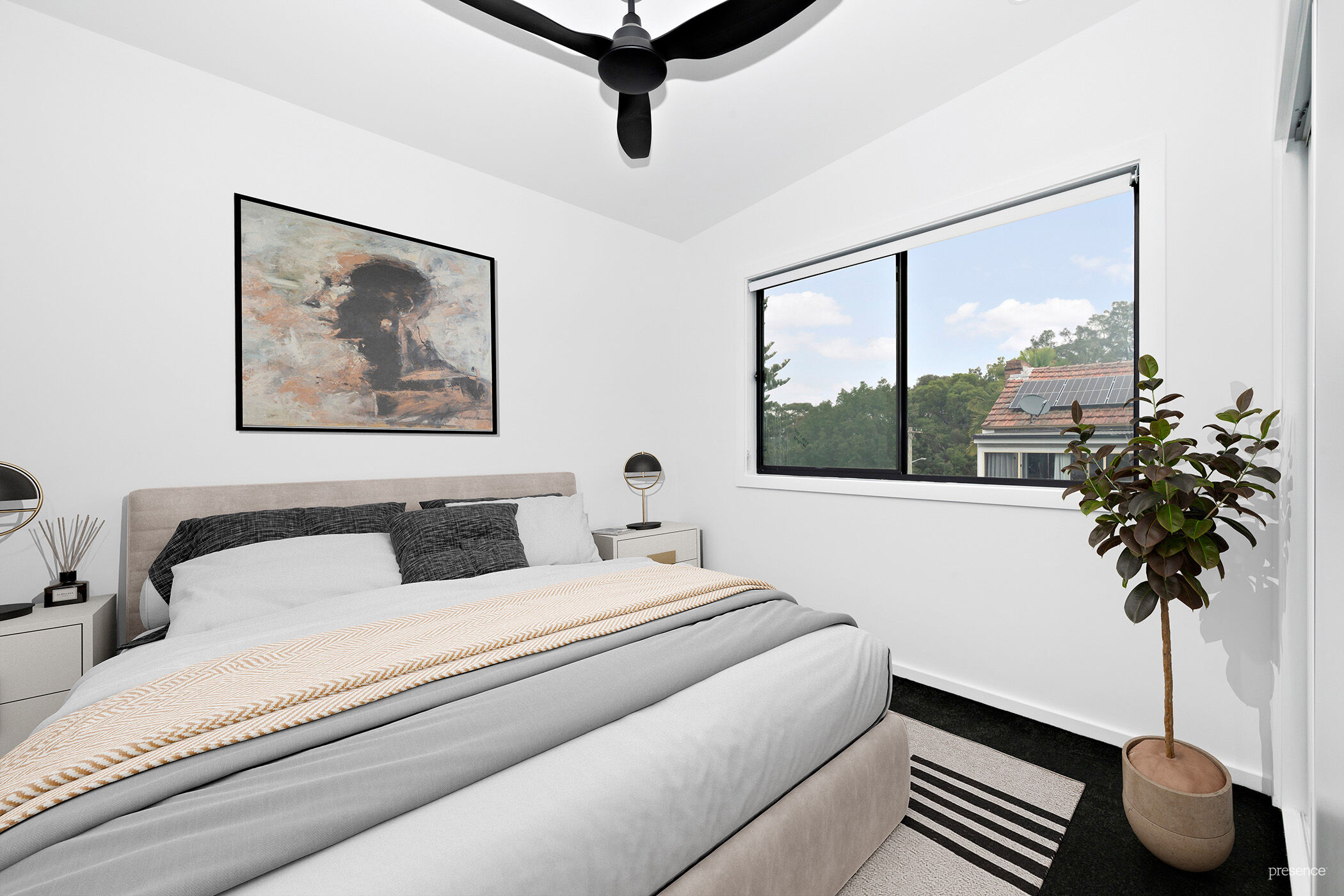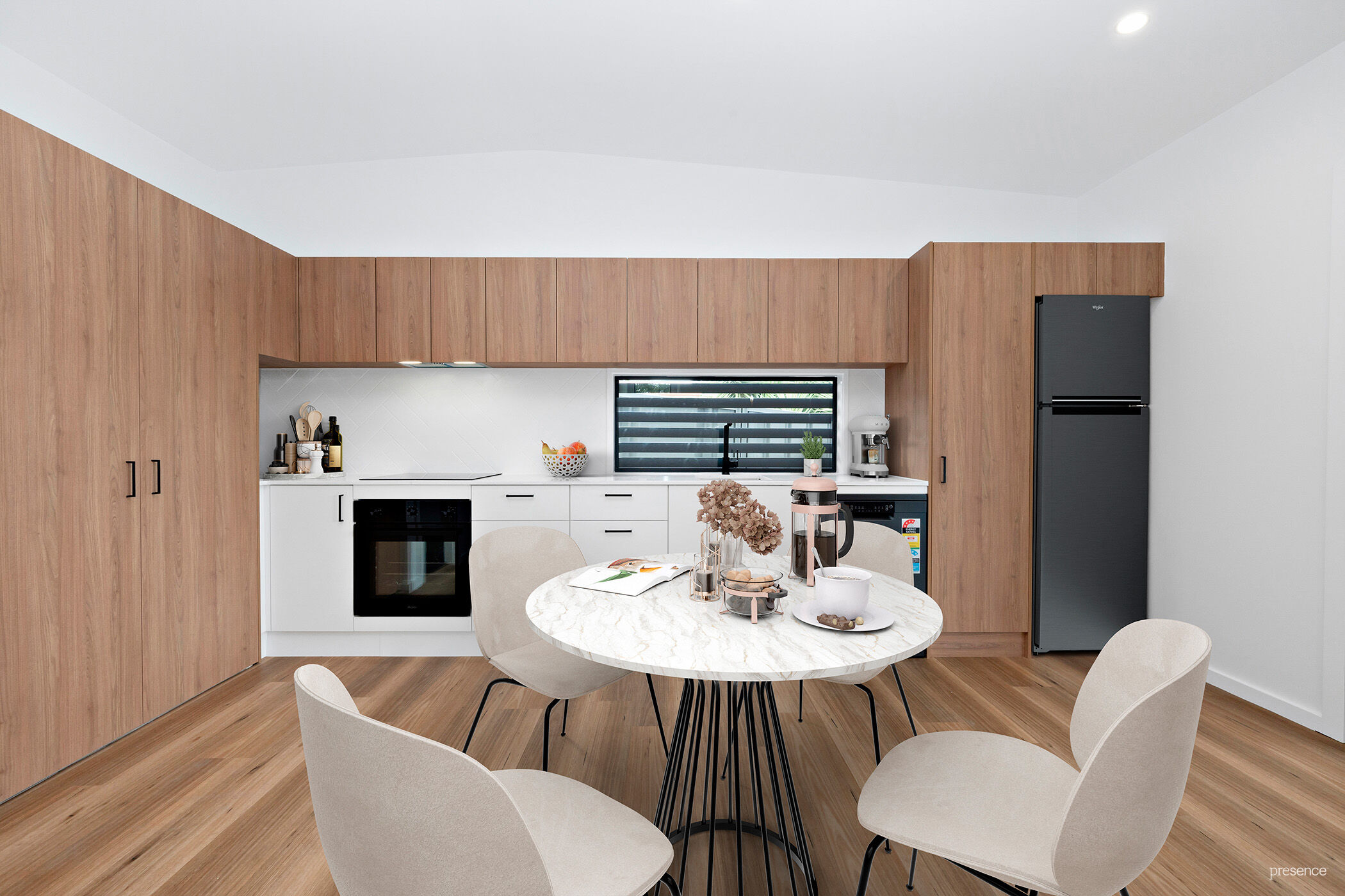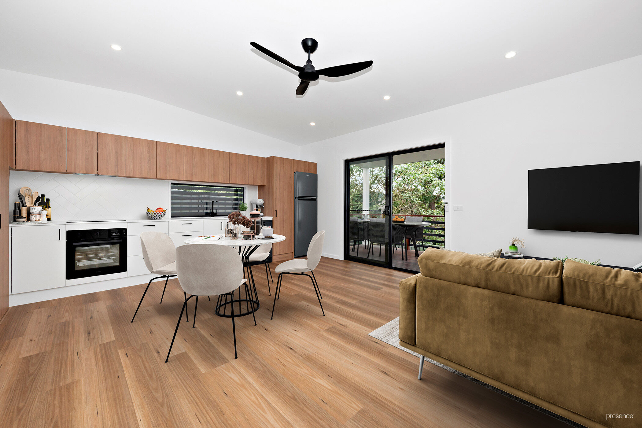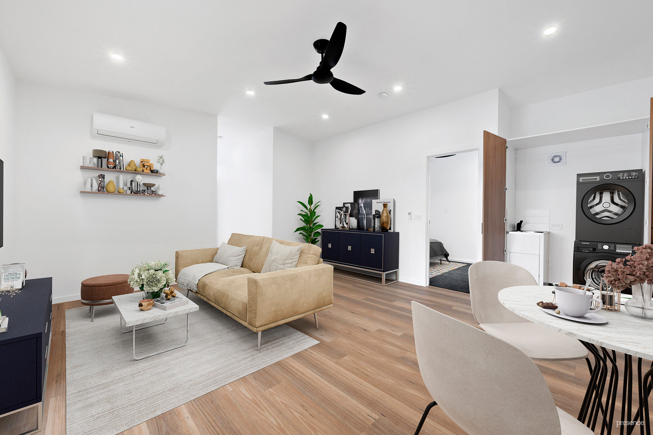The interior showcases a sleek, modern kitchen equipped with high-quality appliances and ample storage, seamlessly flowing into the open-plan living and dining areas. Both bedrooms feature built-in robes, ensuring practicality without compromising on style. Climate control is at your fingertips with reverse cycle air conditioning and split system heating, providing year-round comfort.