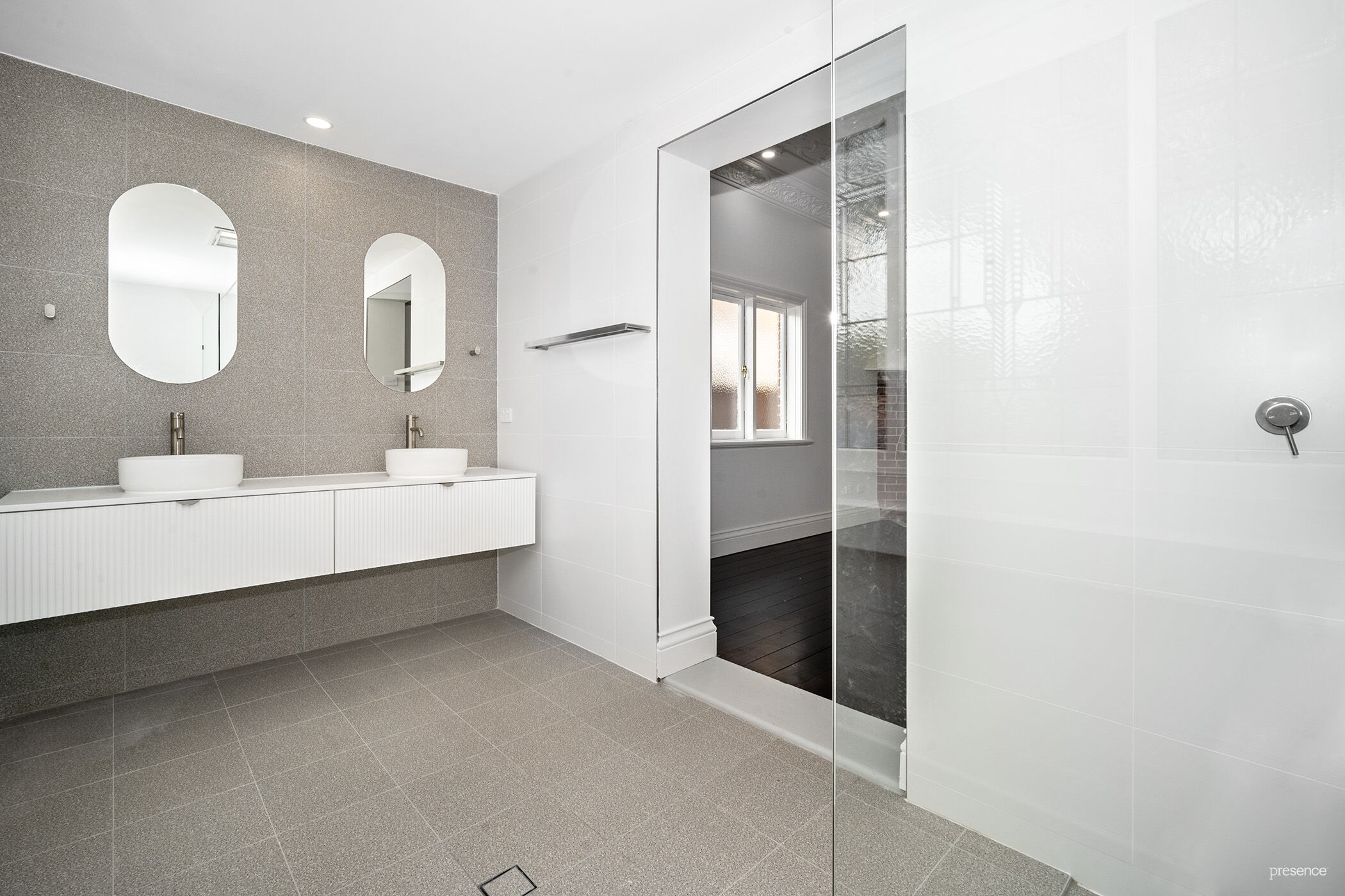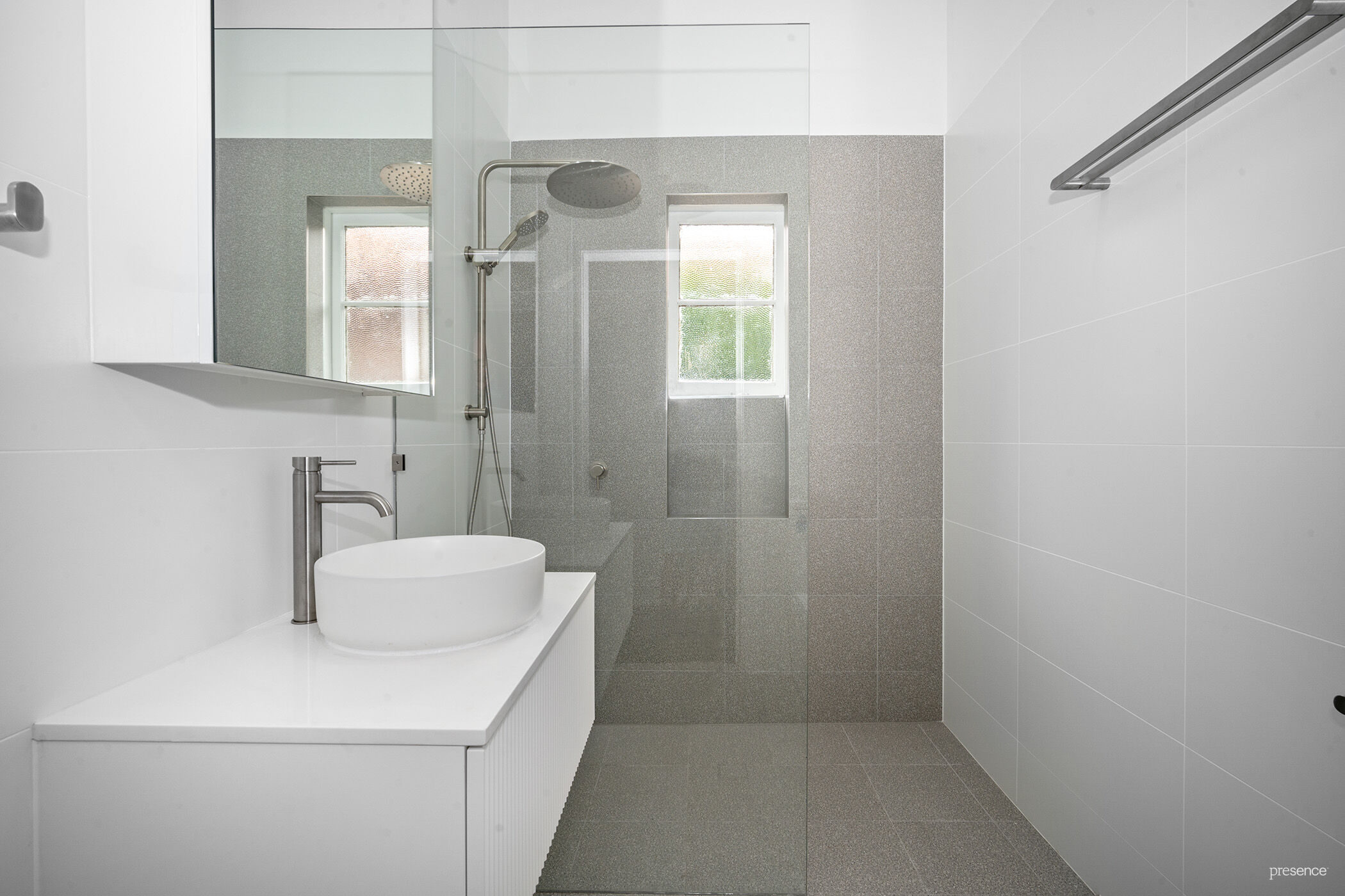– Main sleek and stylish showered bathroom with separate internal laundry