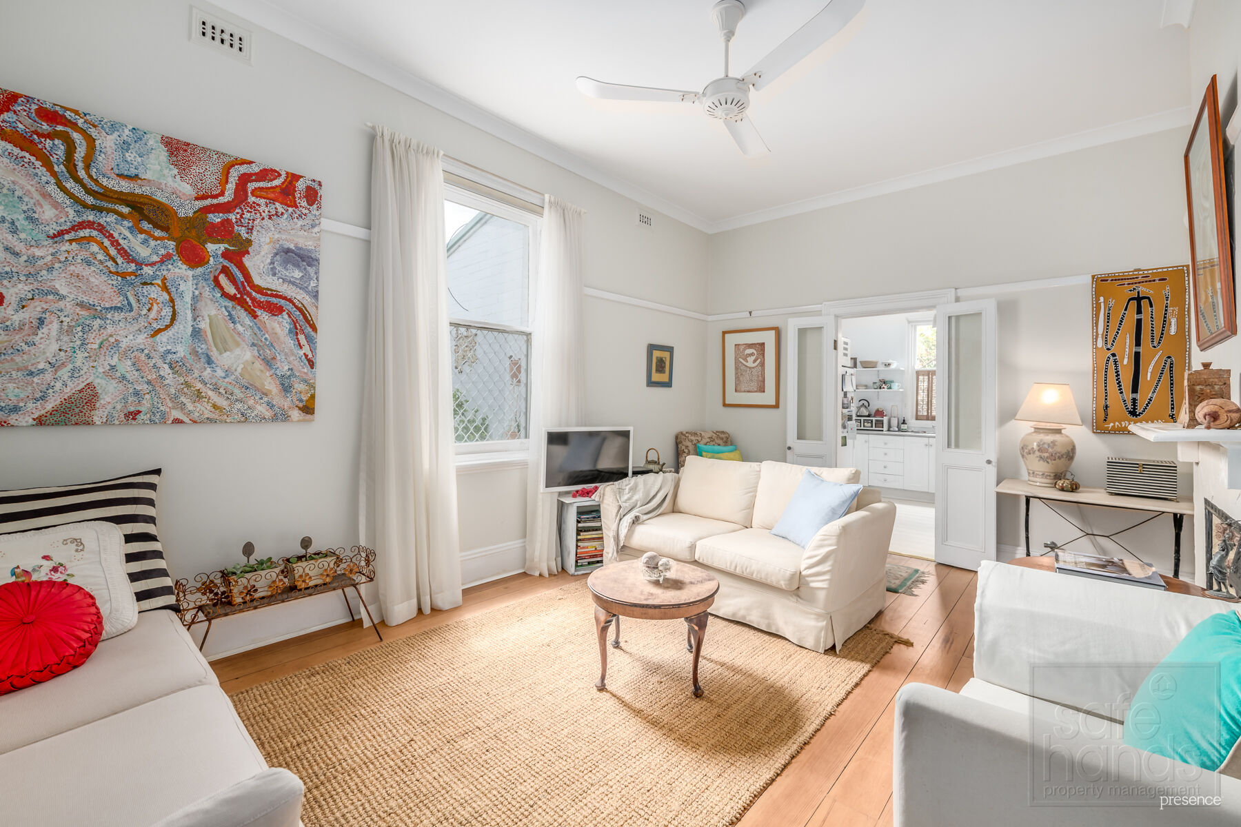 The front entrance of the home gives a welcoming feeling, the verandah is a lovely area to greet friends and enjoy the space. On entering the home, the hallway leads you to a lovely open living room which is filled with loads of natural light and original floorboards.